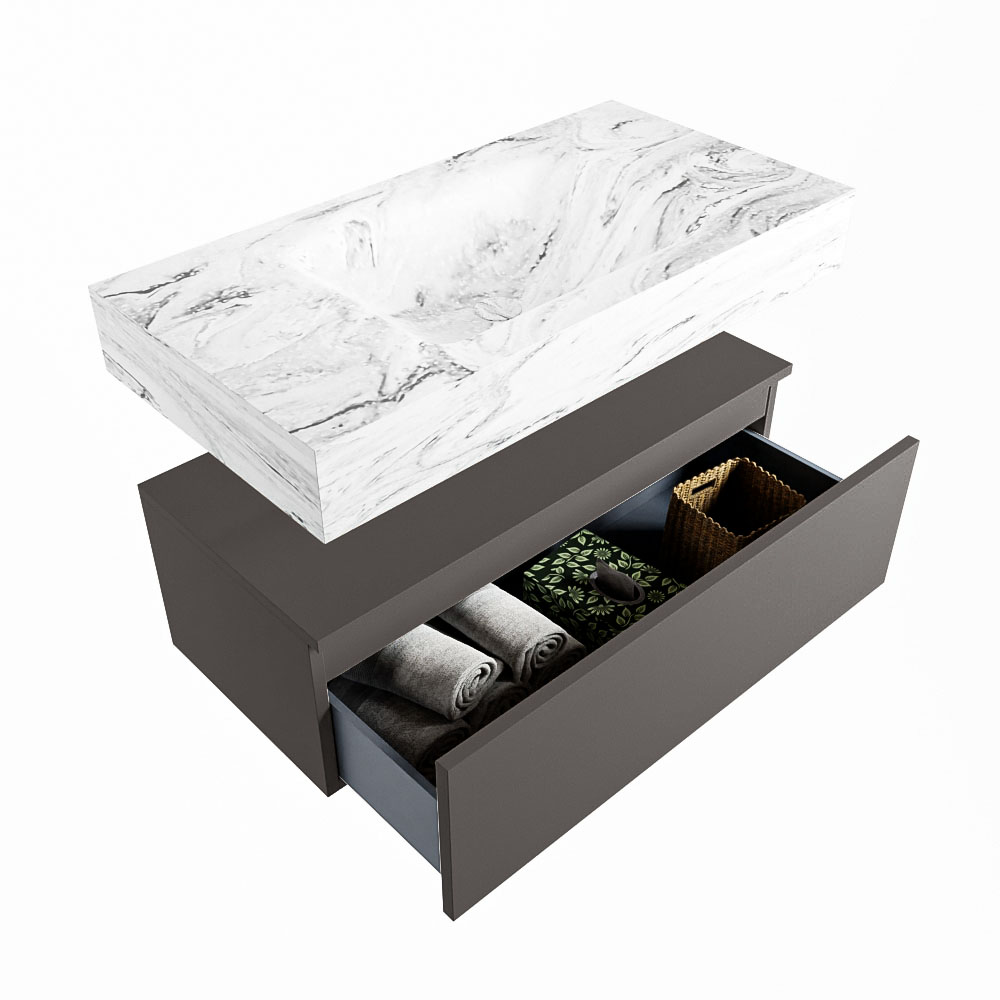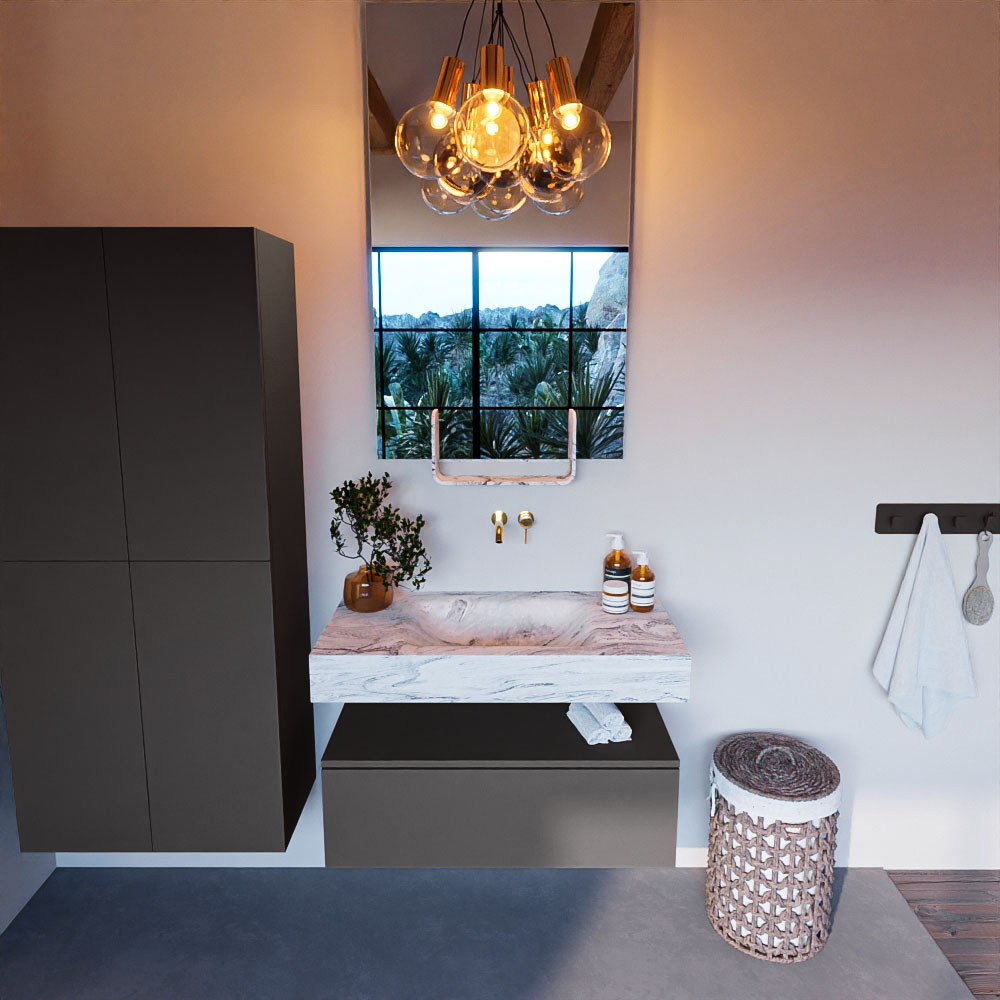 Cree un aspecto elegante y fantástico en su baño con el conjunto de muebles de baño Alan DLUX. El deslumbrante conjunto de muebles de baño ALAN-DLUX consta de un lavabo suspendido con suaves líneas orgánicas de CORIAN en Solid Surface marmolado combinado con el mueble de baño ALAN. El conjunto de muebles de baño ALAN-DLUX es adecuado para cualquier baño, ya sea pequeño o grande. Para completar completamente su baño, también hay disponibles varios accesorios en estos mármoles, como las repisas Mondiaz y los estantes de espejo.