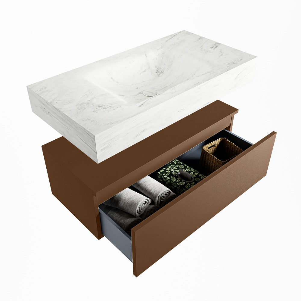 Cree un aspecto elegante y fantástico en su baño con el conjunto de muebles de baño Alan DLUX. El deslumbrante conjunto de muebles de baño ALAN-DLUX consta de un lavabo suspendido con suaves líneas orgánicas de CORIAN en Solid Surface marmolado combinado con el mueble de baño ALAN. El conjunto de muebles de baño ALAN-DLUX es adecuado para cualquier baño, ya sea pequeño o grande. Para completar completamente su baño, también hay disponibles varios accesorios en estos mármoles, como las repisas Mondiaz y los estantes de espejo.