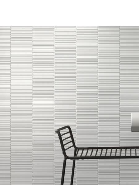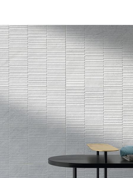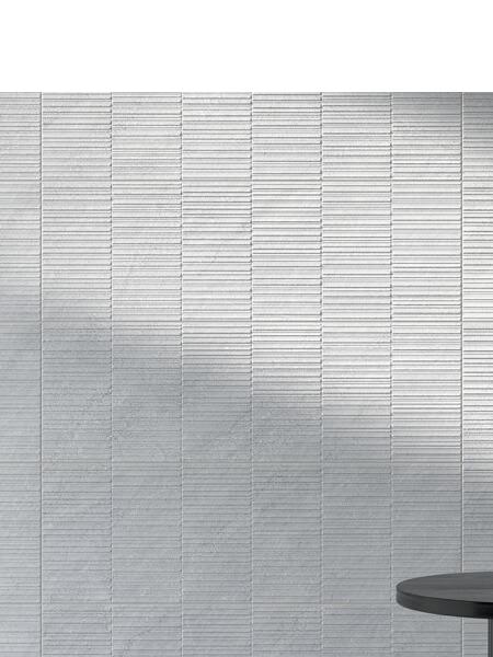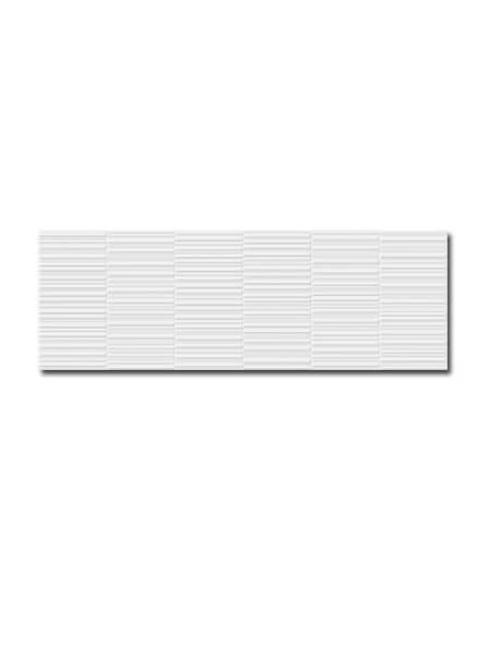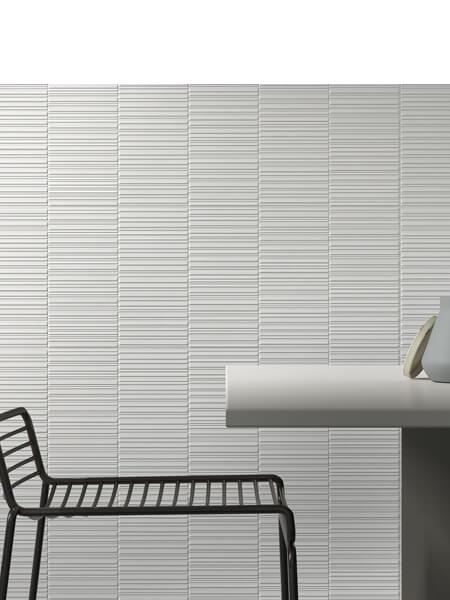 Incluso se recomienda una junta mínima de 2 mm entre las baldosas del azulejo decorado pasta blanca rectificado Section Glaciar mate 30×90 cm.