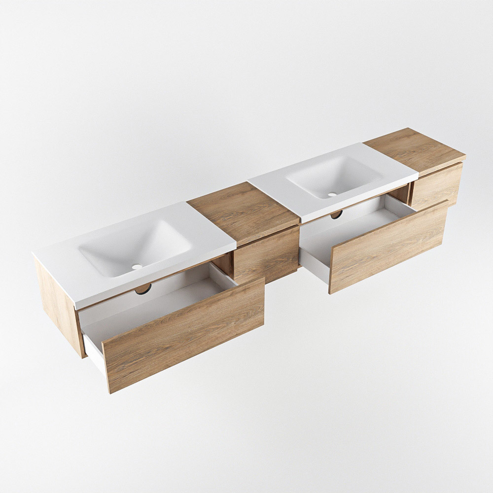 El mueble de baño Bukla combina un lavabo de Solid Surface con una encimera en dos tonos de madera. De esta manera, se logra una hermosa separación entre la zona húmeda y, en el medio o al lado, una hermosa tonalidad de madera que agrega mucha atmósfera y calidez al baño. Con el mueble de baño Bukla, puede crear una variedad infinita de combinaciones y con todas estas posibilidades, puede hacer su propia pieza única que atraerá todas las miradas.