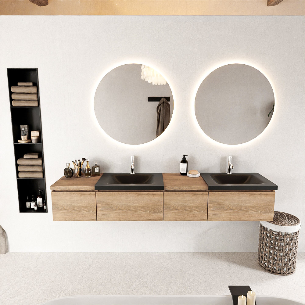 El mueble de baño Bukla combina un lavabo de Solid Surface con una encimera en dos tonos de madera. De esta manera, se logra una hermosa separación entre la zona húmeda y, en el medio o al lado, una hermosa tonalidad de madera que agrega mucha atmósfera y calidez al baño. Con el mueble de baño Bukla, puede crear una variedad infinita de combinaciones y con todas estas posibilidades, puede hacer su propia pieza única que atraerá todas las miradas.