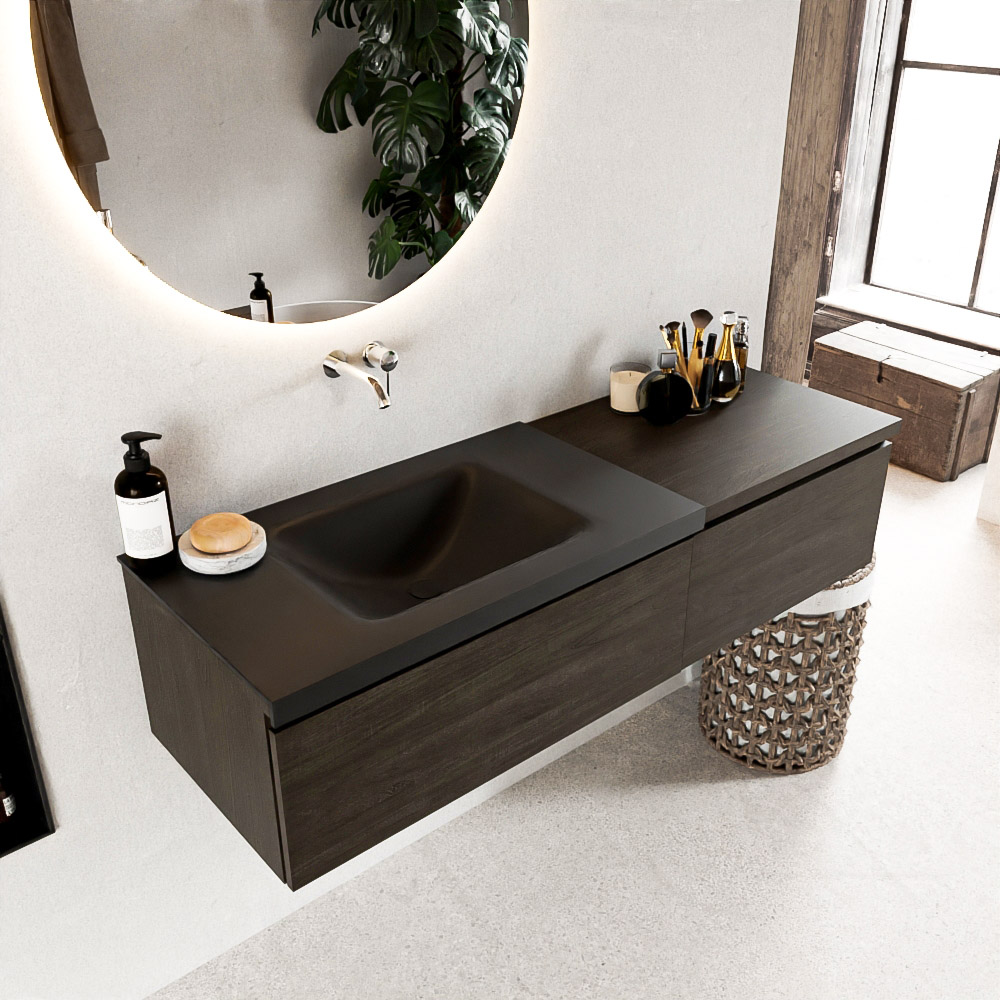 El mueble de baño Bukla combina un lavabo de Solid Surface con una encimera en dos tonos de madera. De esta manera, se logra una hermosa separación entre la zona húmeda y, en el medio o al lado, una hermosa tonalidad de madera que agrega mucha atmósfera y calidez al baño. Con el mueble de baño Bukla, puede crear una variedad infinita de combinaciones y con todas estas posibilidades, puede hacer su propia pieza única que atraerá todas las miradas.