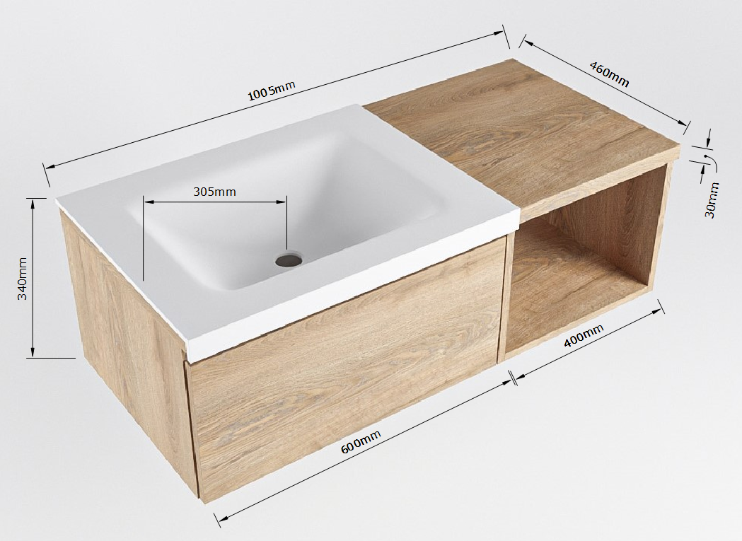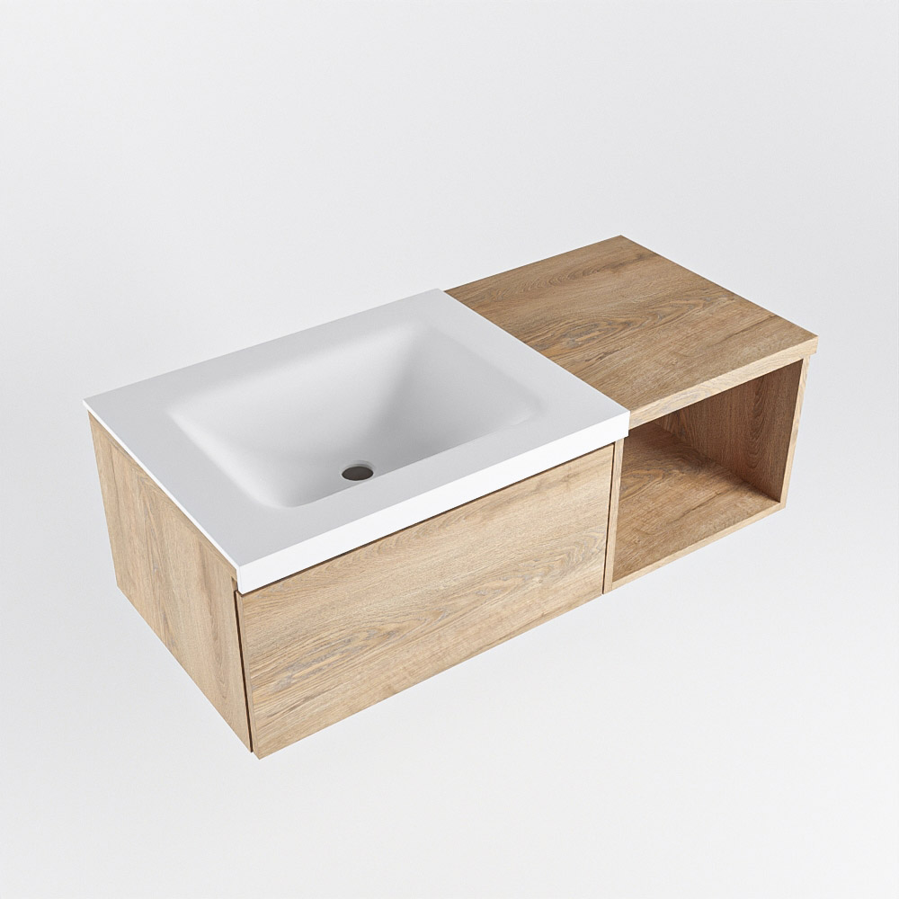 MONDIAZ BUKLA 100cm mueble de baño con módulo abierto 40 Washed Oak 1 cajón. Lavabo CLOUD izquierda sin orificios color Talc