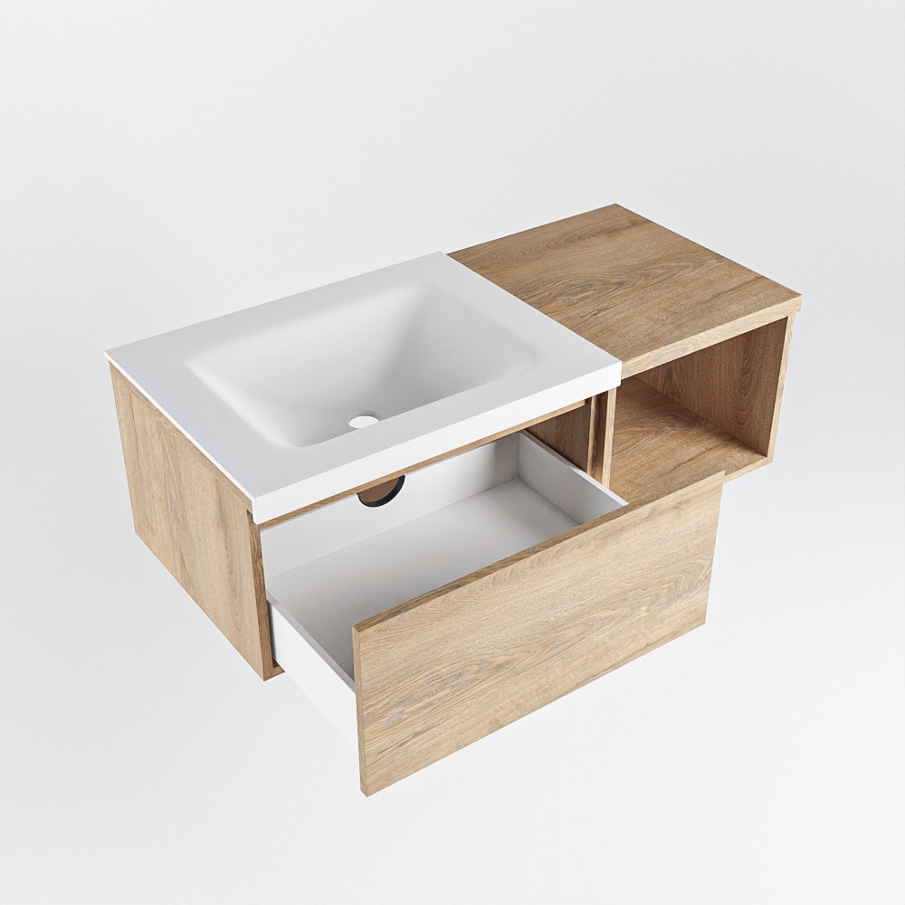 El mueble de baño Bukla combina un lavabo de Solid Surface con una encimera en dos tonos de madera. De esta manera, se logra una hermosa separación entre la zona húmeda y, en el medio o al lado, una hermosa tonalidad de madera que agrega mucha atmósfera y calidez al baño. Con el mueble de baño Bukla, puede crear una variedad infinita de combinaciones y con todas estas posibilidades, puede hacer su propia pieza única que atraerá todas las miradas.