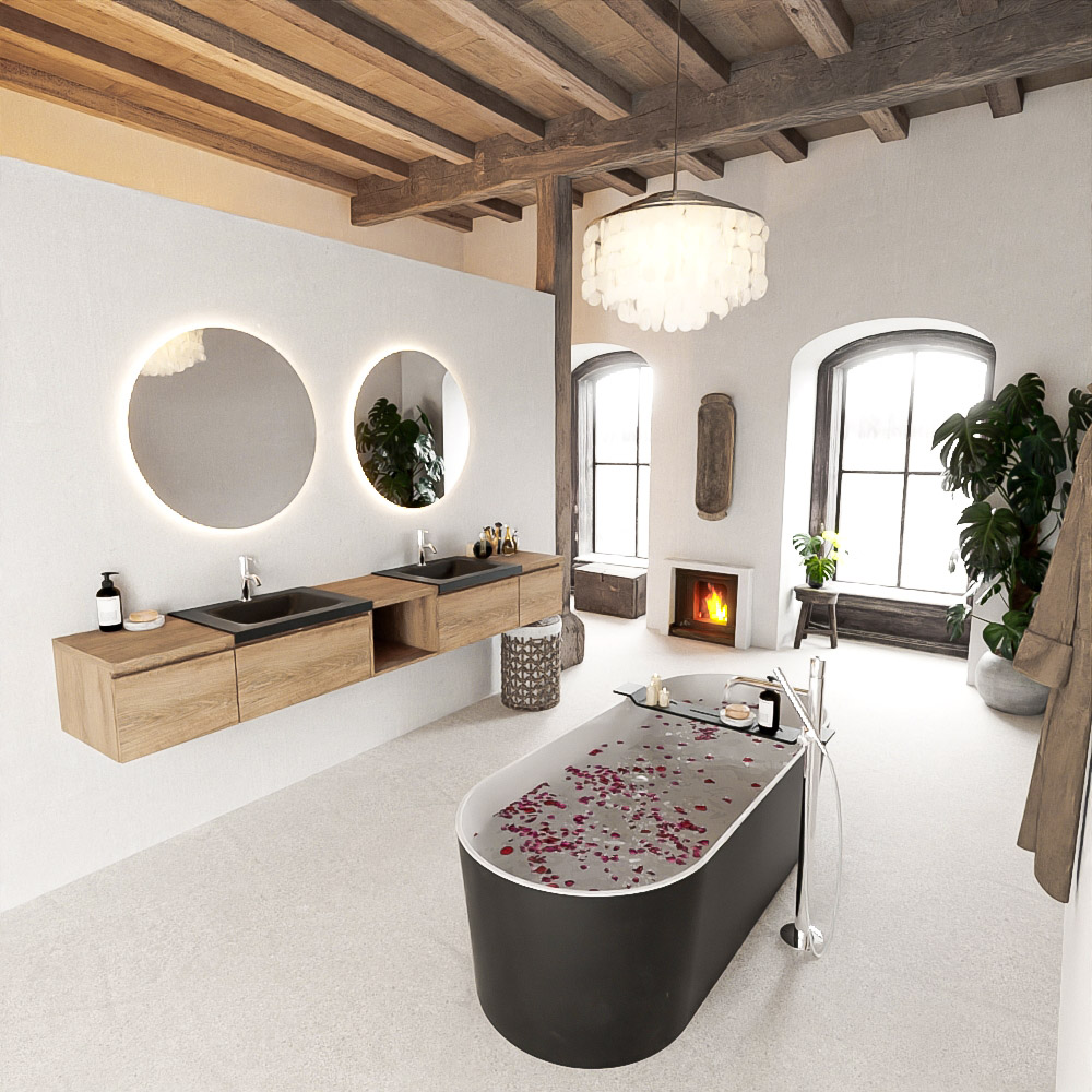 El mueble de baño Bukla combina un lavabo de Solid Surface con una encimera en dos tonos de madera. De esta manera, se logra una hermosa separación entre la zona húmeda y, en el medio o al lado, una hermosa tonalidad de madera que agrega mucha atmósfera y calidez al baño. Con el mueble de baño Bukla, puede crear una variedad infinita de combinaciones y con todas estas posibilidades, puede hacer su propia pieza única que atraerá todas las miradas.