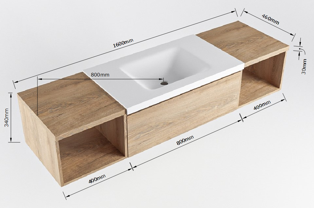 El mueble de baño Bukla combina un lavabo de Solid Surface con una encimera en dos tonos de madera. De esta manera, se logra una hermosa separación entre la zona húmeda y, en el medio o al lado, una hermosa tonalidad de madera que agrega mucha atmósfera y calidez al baño. Con el mueble de baño Bukla, puede crear una variedad infinita de combinaciones y con todas estas posibilidades, puede hacer su propia pieza única que atraerá todas las miradas.