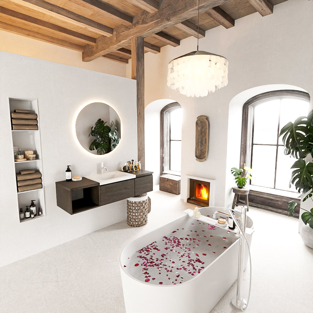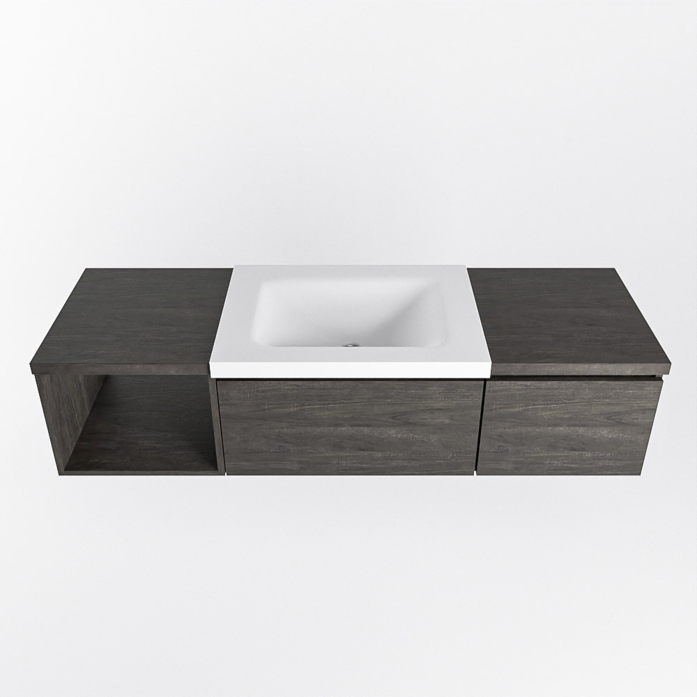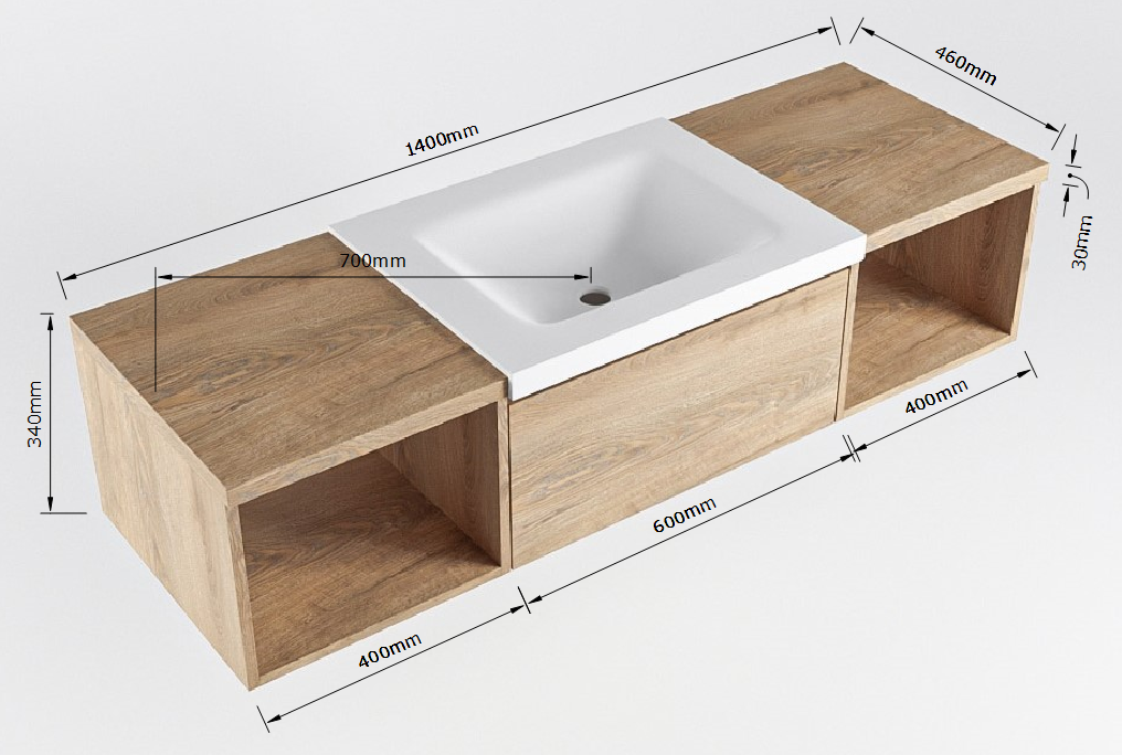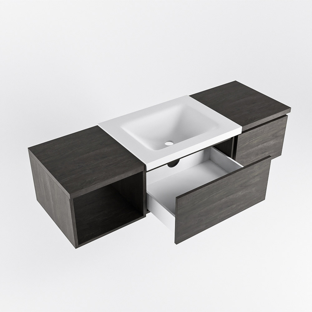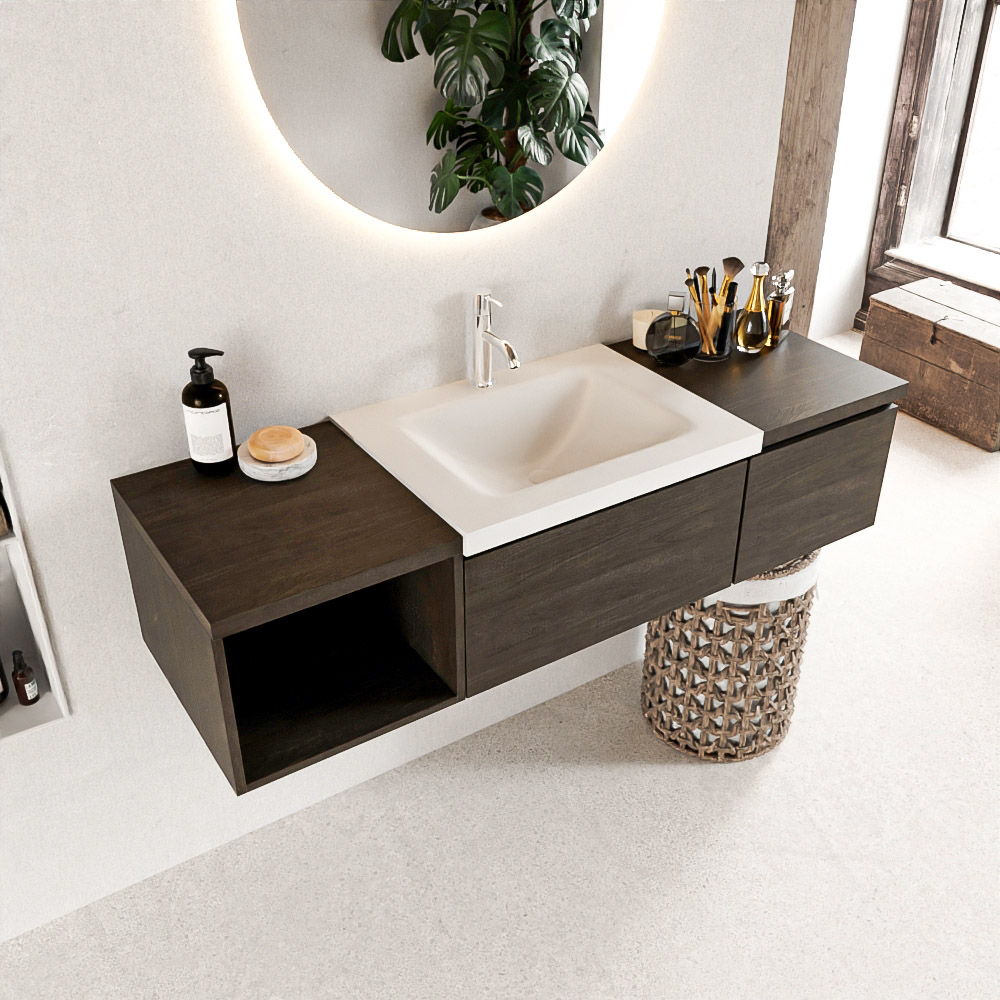El mueble de baño Bukla combina un lavabo de Solid Surface con una encimera en dos tonos de madera. De esta manera, se logra una hermosa separación entre la zona húmeda y, en el medio o al lado, una hermosa tonalidad de madera que agrega mucha atmósfera y calidez al baño. Con el mueble de baño Bukla, puede crear una variedad infinita de combinaciones y con todas estas posibilidades, puede hacer su propia pieza única que atraerá todas las miradas.