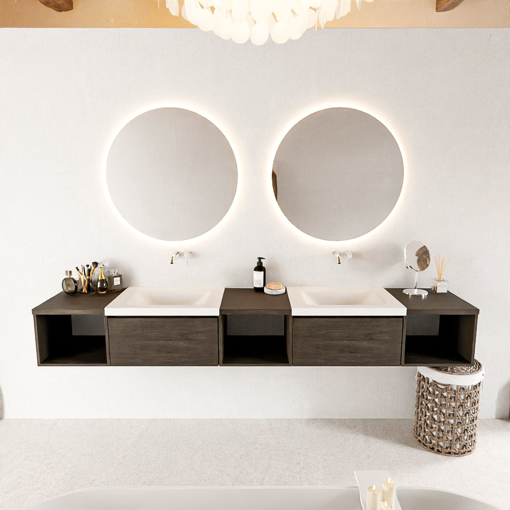 El mueble de baño Bukla combina un lavabo de Solid Surface con una encimera en dos tonos de madera. De esta manera, se logra una hermosa separación entre la zona húmeda y, en el medio o al lado, una hermosa tonalidad de madera que agrega mucha atmósfera y calidez al baño. Con el mueble de baño Bukla, puede crear una variedad infinita de combinaciones y con todas estas posibilidades, puede hacer su propia pieza única que atraerá todas las miradas.