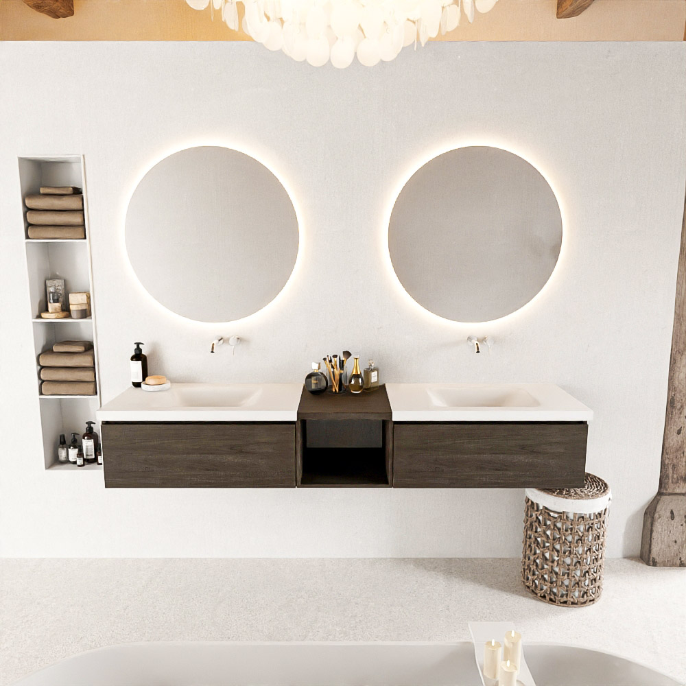 El mueble de baño Bukla combina un lavabo de Solid Surface con una encimera en dos tonos de madera. De esta manera, se logra una hermosa separación entre la zona húmeda y, en el medio o al lado, una hermosa tonalidad de madera que agrega mucha atmósfera y calidez al baño. Con el mueble de baño Bukla, puede crear una variedad infinita de combinaciones y con todas estas posibilidades, puede hacer su propia pieza única que atraerá todas las miradas.