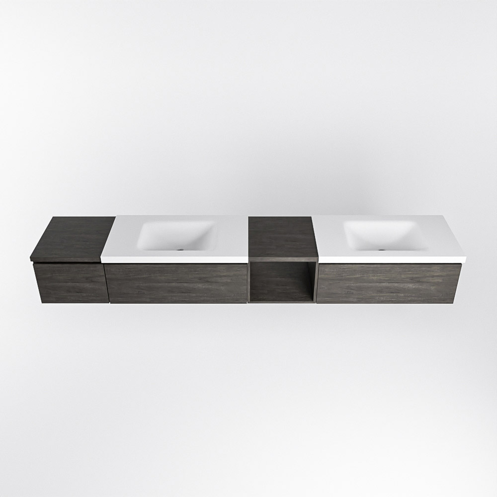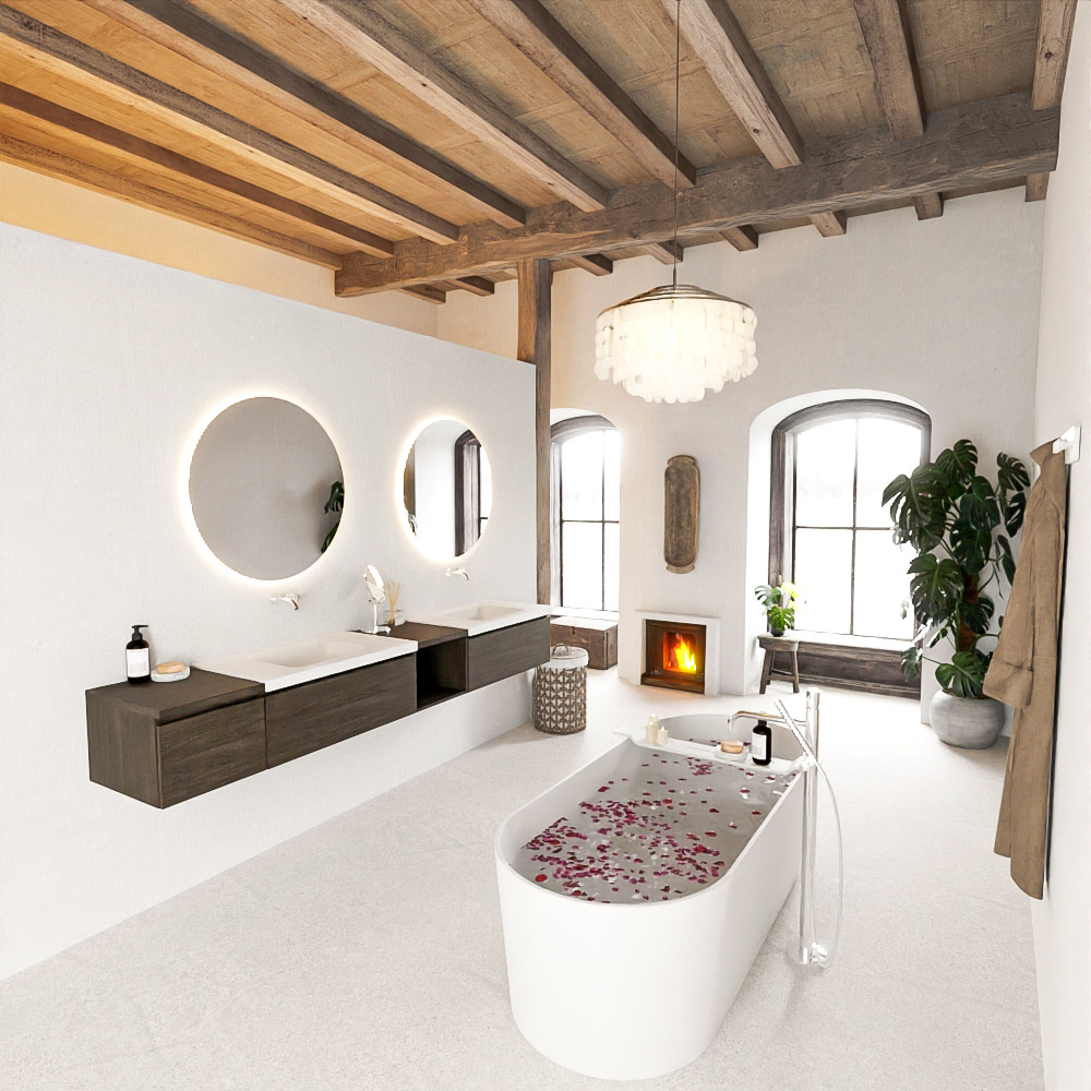 El mueble de baño Bukla combina un lavabo de Solid Surface con una encimera en dos tonos de madera. De esta manera, se logra una hermosa separación entre la zona húmeda y, en el medio o al lado, una hermosa tonalidad de madera que agrega mucha atmósfera y calidez al baño. Con el mueble de baño Bukla, puede crear una variedad infinita de combinaciones y con todas estas posibilidades, puede hacer su propia pieza única que atraerá todas las miradas.