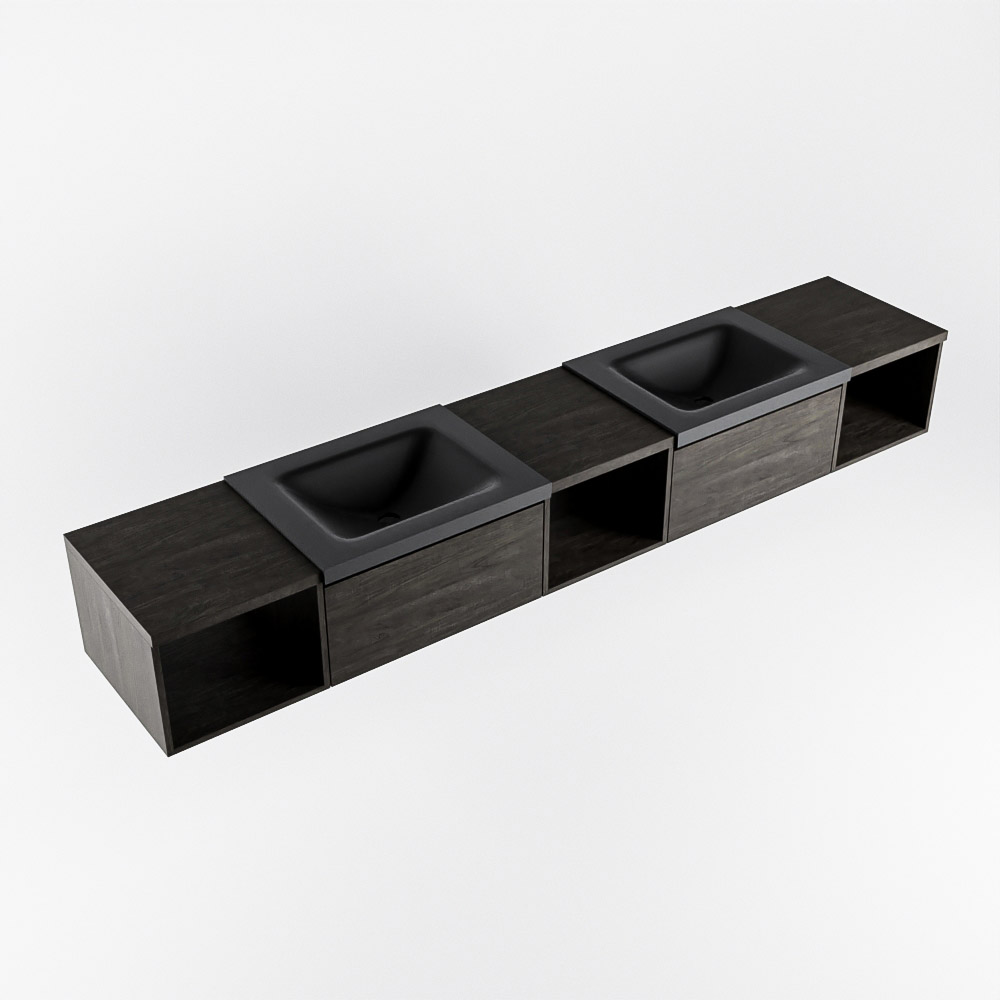 El mueble de baño Bukla combina un lavabo de Solid Surface con una encimera en dos tonos de madera. De esta manera, se logra una hermosa separación entre la zona húmeda y, en el medio o al lado, una hermosa tonalidad de madera que agrega mucha atmósfera y calidez al baño. Con el mueble de baño Bukla, puede crear una variedad infinita de combinaciones y con todas estas posibilidades, puede hacer su propia pieza única que atraerá todas las miradas.