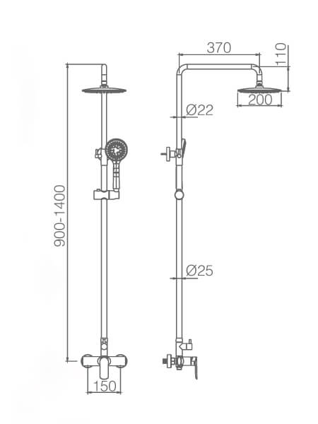 En la parte superior posee un brazo de ducha, un gran rociador cuadrado y extraplano, de niquel cepilladoniquel 304, de 20 cm, con una rótula orientable y antical.