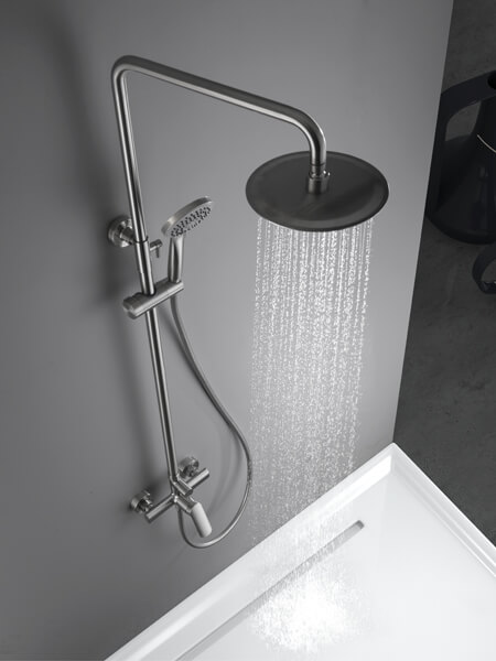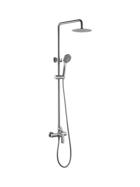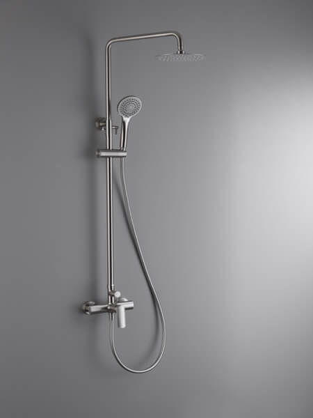 Sugerente y atractivo conjunto de ducha monomando con acabado niquel cepillado.