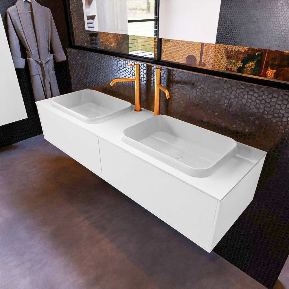 El lavabo de inserción tiene un borde elevado con un lavamanos extra grande y profundo. Las formas redondas del lavamanos emanan una suavidad lujosa. La ubicación del grifo del lavabo en la esquina del lavamanos añade un efecto juguetón adicional. El mueble de baño del conjunto ERIN cuenta con un cajón “push to open”. Esto le proporciona al mueble de baño una apariencia hermosa y aerodinámica que se adapta a cualquier estilo de baño.