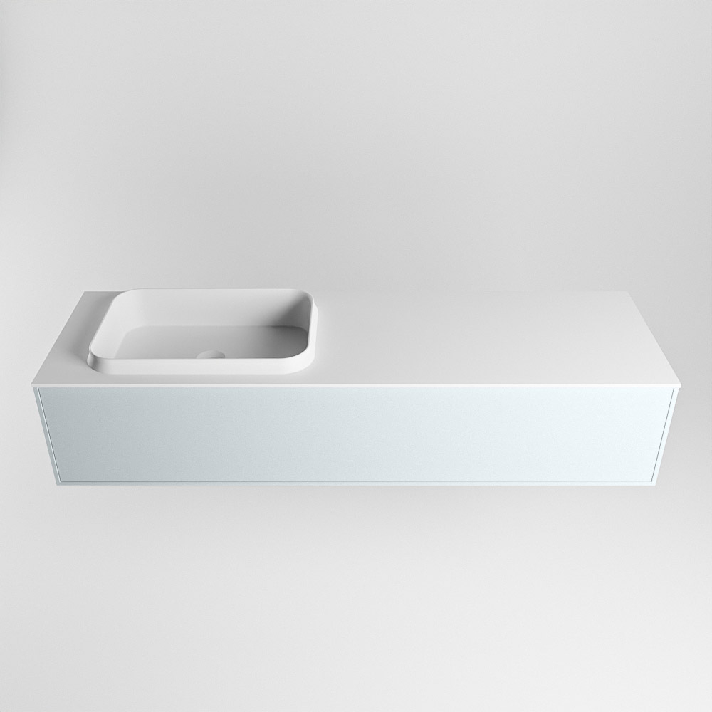 El lavabo de inserción tiene un borde elevado con un lavamanos extra grande y profundo. Las formas redondas del lavamanos emanan una suavidad lujosa. La ubicación del grifo del lavabo en la esquina del lavamanos añade un efecto juguetón adicional. El mueble de baño del conjunto ERIN cuenta con un cajón “push to open”. Esto le proporciona al mueble de baño una apariencia hermosa y aerodinámica que se adapta a cualquier estilo de baño.