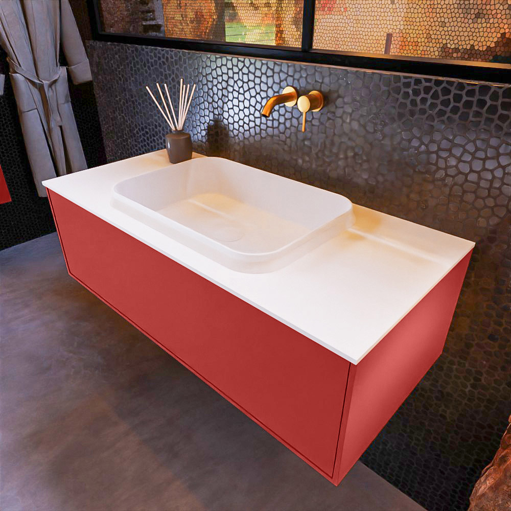 El lavabo de inserción tiene un borde elevado con un lavamanos extra grande y profundo. Las formas redondas del lavamanos emanan una suavidad lujosa. La ubicación del grifo del lavabo en la esquina del lavamanos añade un efecto juguetón adicional. El mueble de baño del conjunto ERIN cuenta con un cajón “push to open”. Esto le proporciona al mueble de baño una apariencia hermosa y aerodinámica que se adapta a cualquier estilo de baño.