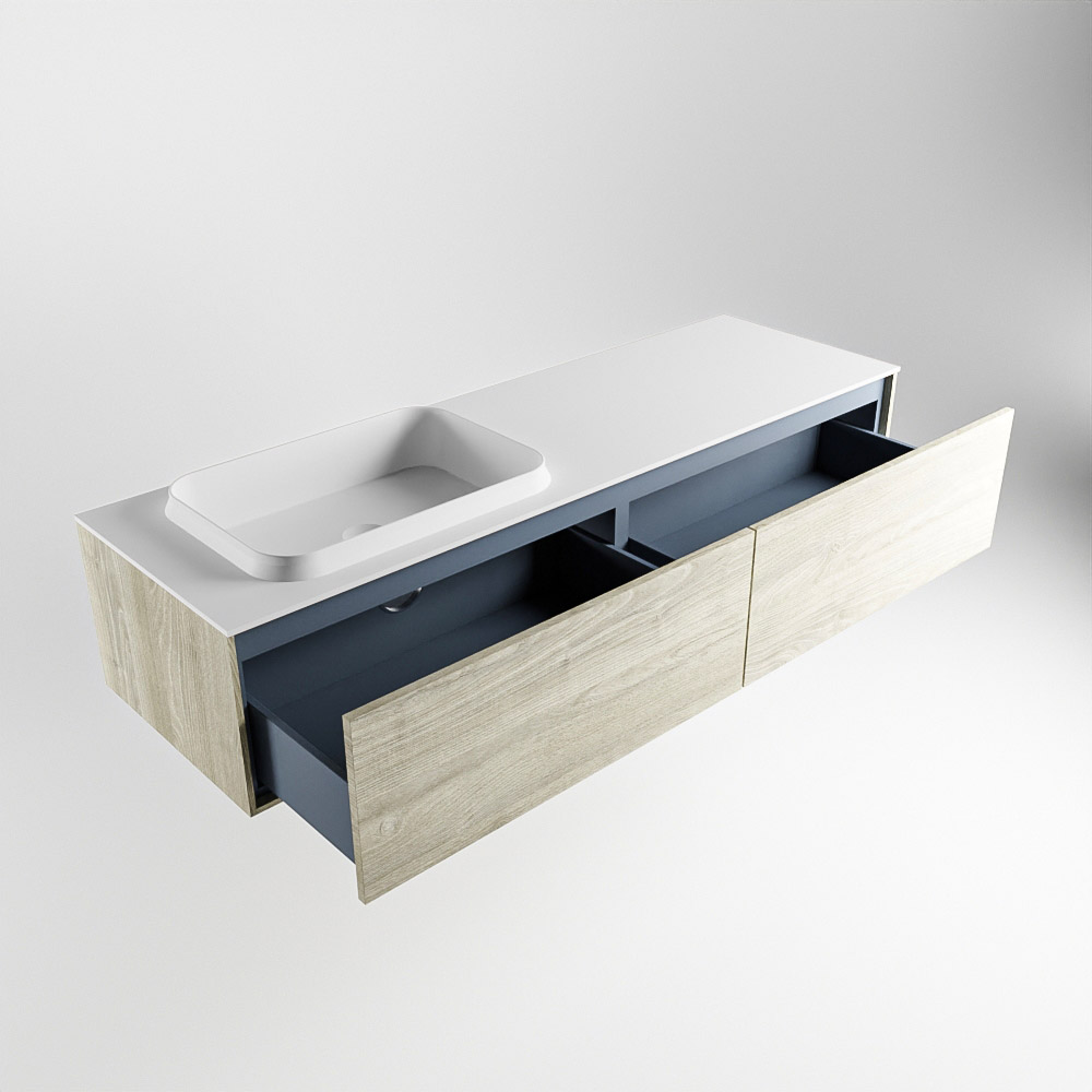 El lavabo de inserción tiene un borde elevado con un lavamanos extra grande y profundo. Las formas redondas del lavamanos emanan una suavidad lujosa. La ubicación del grifo del lavabo en la esquina del lavamanos añade un efecto juguetón adicional. El mueble de baño del conjunto ERIN cuenta con un cajón “push to open”. Esto le proporciona al mueble de baño una apariencia hermosa y aerodinámica que se adapta a cualquier estilo de baño.