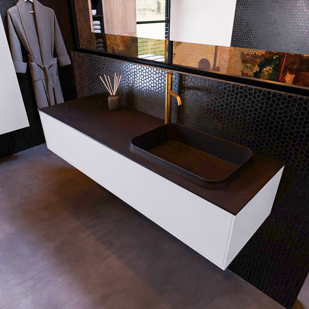 El lavabo de inserción tiene un borde elevado con un lavamanos extra grande y profundo. Las formas redondas del lavamanos emanan una suavidad lujosa. La ubicación del grifo del lavabo en la esquina del lavamanos añade un efecto juguetón adicional. El mueble de baño del conjunto ERIN cuenta con un cajón “push to open”. Esto le proporciona al mueble de baño una apariencia hermosa y aerodinámica que se adapta a cualquier estilo de baño.
