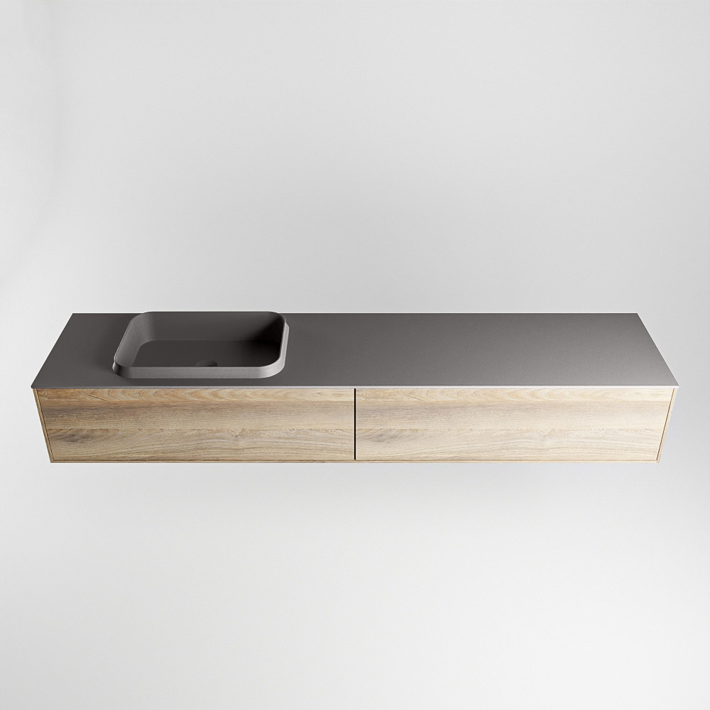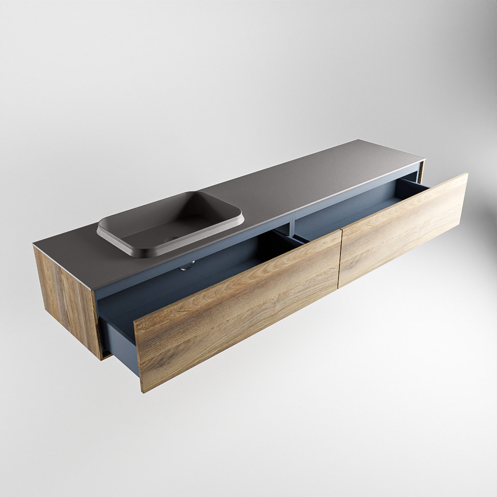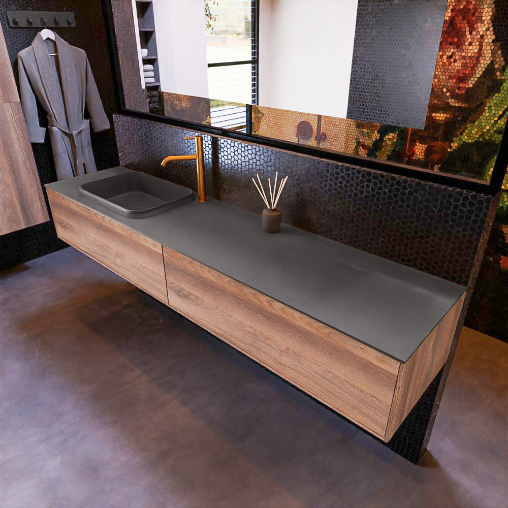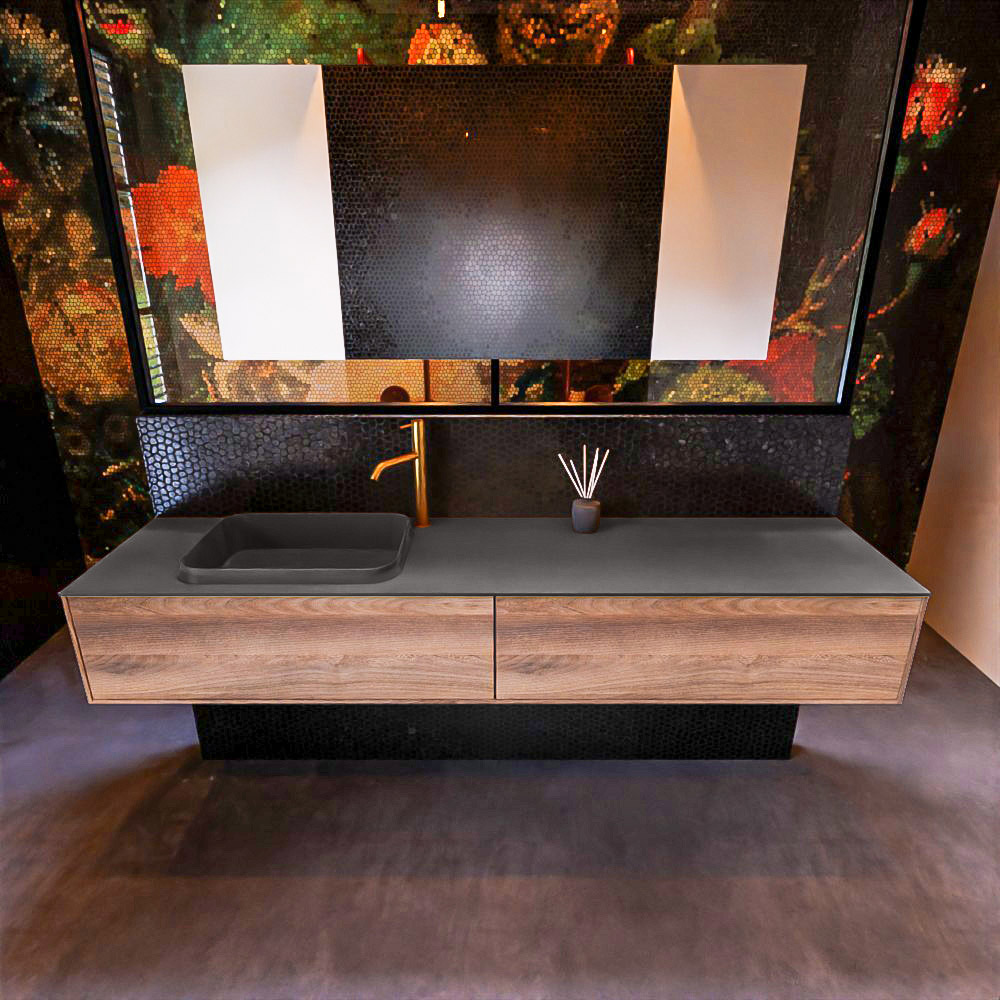 El lavabo de inserción tiene un borde elevado con un lavamanos extra grande y profundo. Las formas redondas del lavamanos emanan una suavidad lujosa. La ubicación del grifo del lavabo en la esquina del lavamanos añade un efecto juguetón adicional. El mueble de baño del conjunto ERIN cuenta con un cajón “push to open”. Esto le proporciona al mueble de baño una apariencia hermosa y aerodinámica que se adapta a cualquier estilo de baño.