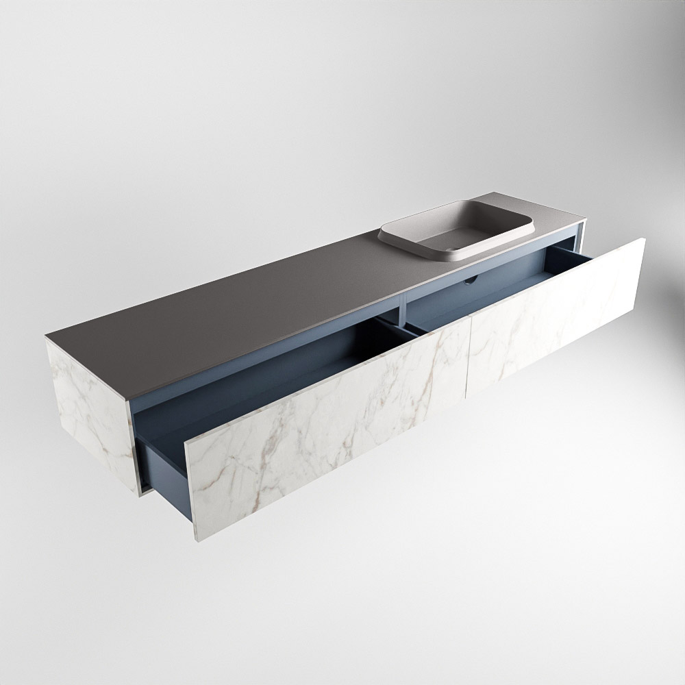 El lavabo de inserción tiene un borde elevado con un lavamanos extra grande y profundo. Las formas redondas del lavamanos emanan una suavidad lujosa. La ubicación del grifo del lavabo en la esquina del lavamanos añade un efecto juguetón adicional. El mueble de baño del conjunto ERIN cuenta con un cajón “push to open”. Esto le proporciona al mueble de baño una apariencia hermosa y aerodinámica que se adapta a cualquier estilo de baño.