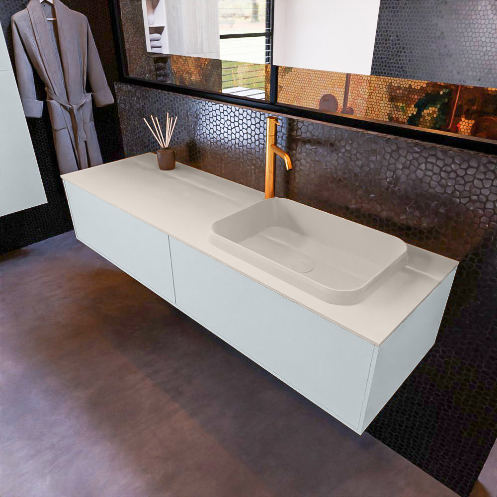 El lavabo de inserción tiene un borde elevado con un lavamanos extra grande y profundo. Las formas redondas del lavamanos emanan una suavidad lujosa. La ubicación del grifo del lavabo en la esquina del lavamanos añade un efecto juguetón adicional. El mueble de baño del conjunto ERIN cuenta con un cajón “push to open”. Esto le proporciona al mueble de baño una apariencia hermosa y aerodinámica que se adapta a cualquier estilo de baño.