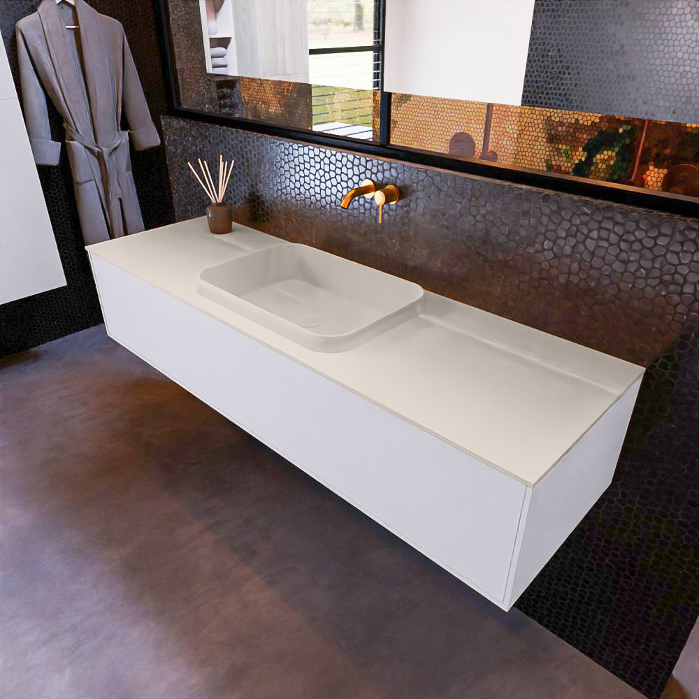 El lavabo de inserción tiene un borde elevado con un lavamanos extra grande y profundo. Las formas redondas del lavamanos emanan una suavidad lujosa. La ubicación del grifo del lavabo en la esquina del lavamanos añade un efecto juguetón adicional. El mueble de baño del conjunto ERIN cuenta con un cajón “push to open”. Esto le proporciona al mueble de baño una apariencia hermosa y aerodinámica que se adapta a cualquier estilo de baño.