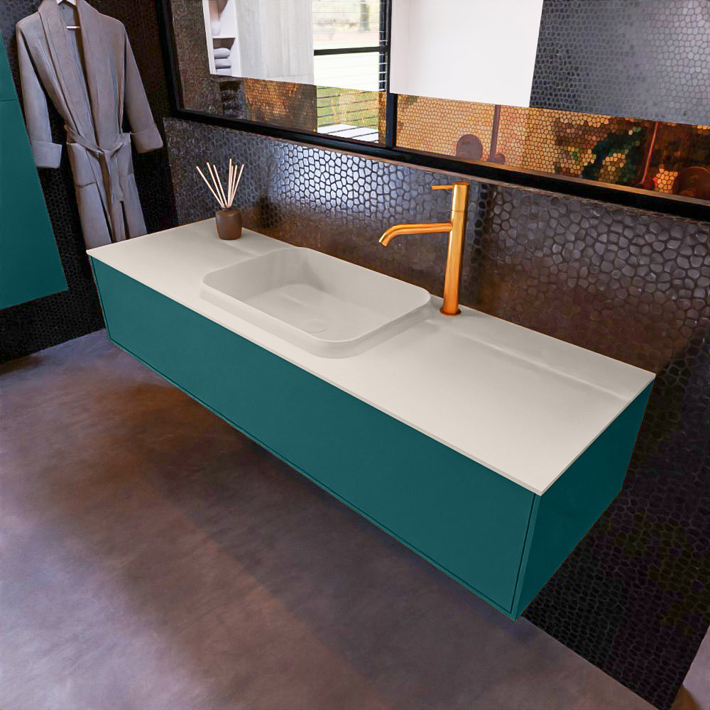 El lavabo de inserción tiene un borde elevado con un lavamanos extra grande y profundo. Las formas redondas del lavamanos emanan una suavidad lujosa. La ubicación del grifo del lavabo en la esquina del lavamanos añade un efecto juguetón adicional. El mueble de baño del conjunto ERIN cuenta con un cajón “push to open”. Esto le proporciona al mueble de baño una apariencia hermosa y aerodinámica que se adapta a cualquier estilo de baño.