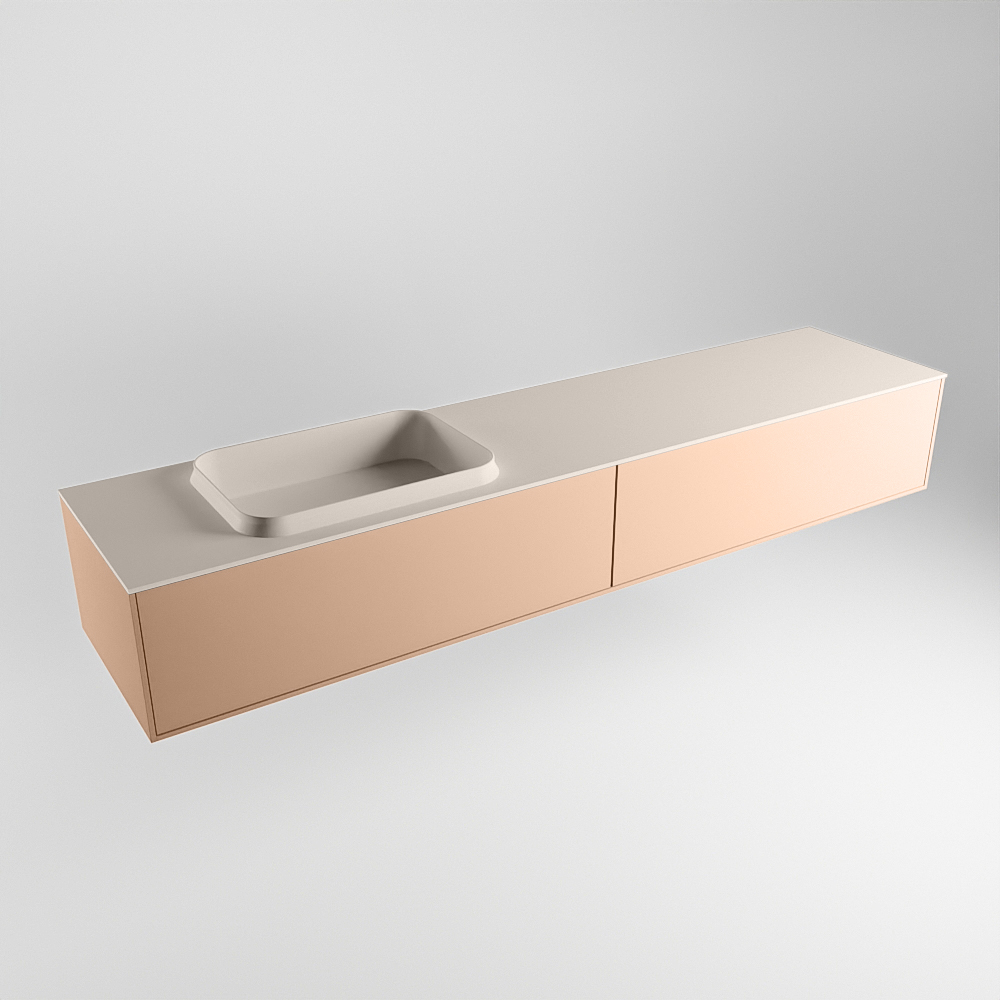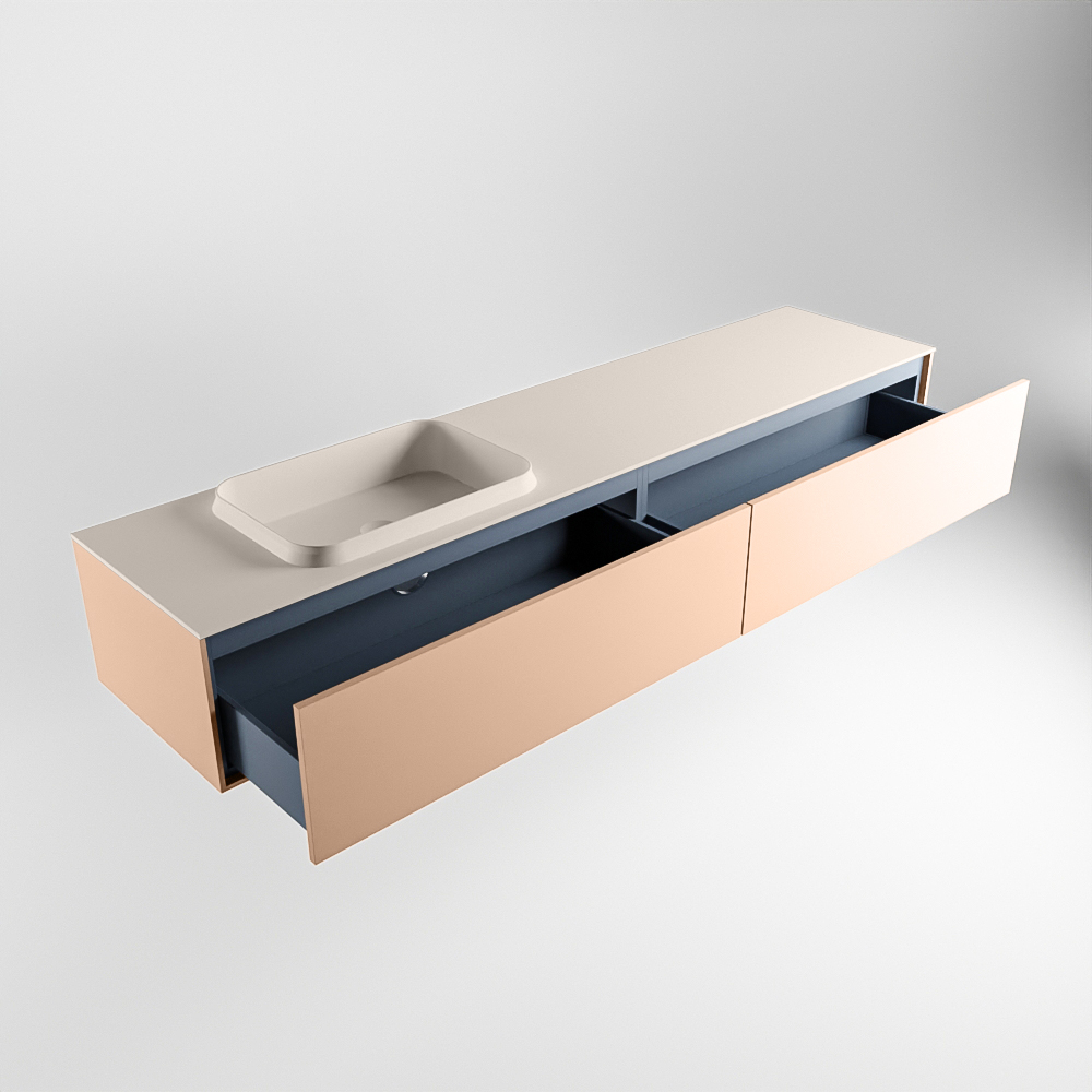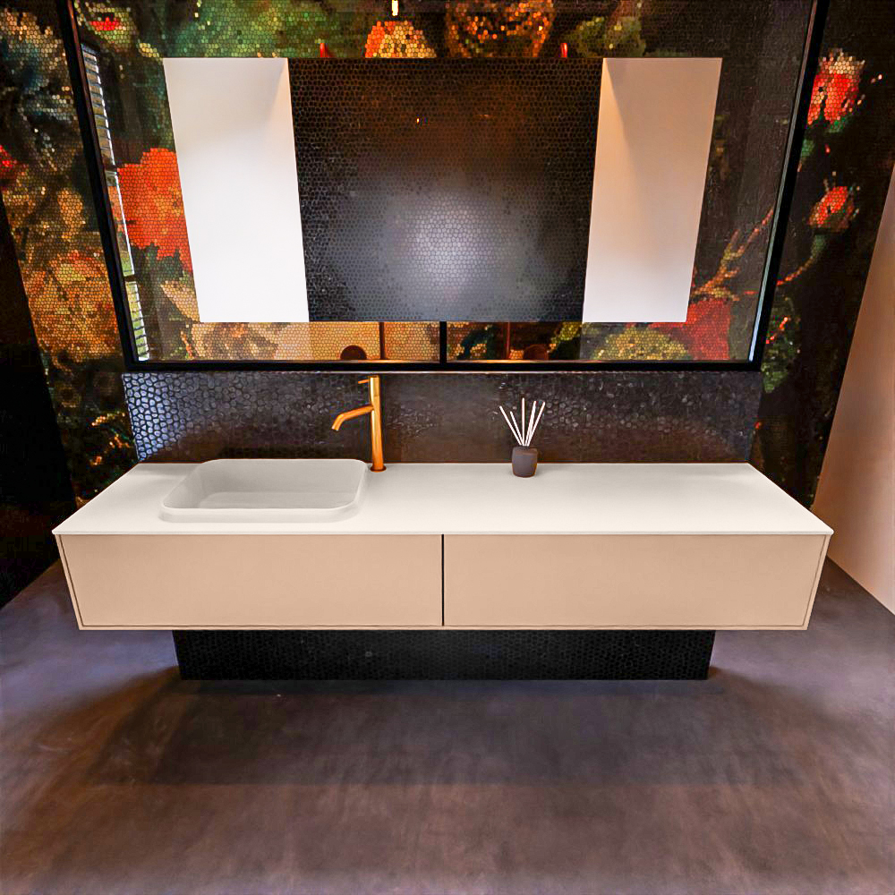 El lavabo de inserción tiene un borde elevado con un lavamanos extra grande y profundo. Las formas redondas del lavamanos emanan una suavidad lujosa. La ubicación del grifo del lavabo en la esquina del lavamanos añade un efecto juguetón adicional. El mueble de baño del conjunto ERIN cuenta con un cajón “push to open”. Esto le proporciona al mueble de baño una apariencia hermosa y aerodinámica que se adapta a cualquier estilo de baño.