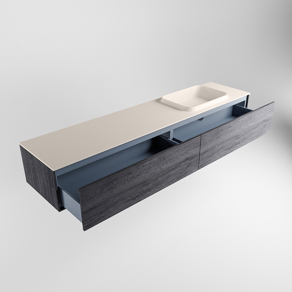 El lavabo de inserción tiene un borde elevado con un lavamanos extra grande y profundo. Las formas redondas del lavamanos emanan una suavidad lujosa. La ubicación del grifo del lavabo en la esquina del lavamanos añade un efecto juguetón adicional. El mueble de baño del conjunto ERIN cuenta con un cajón “push to open”. Esto le proporciona al mueble de baño una apariencia hermosa y aerodinámica que se adapta a cualquier estilo de baño.