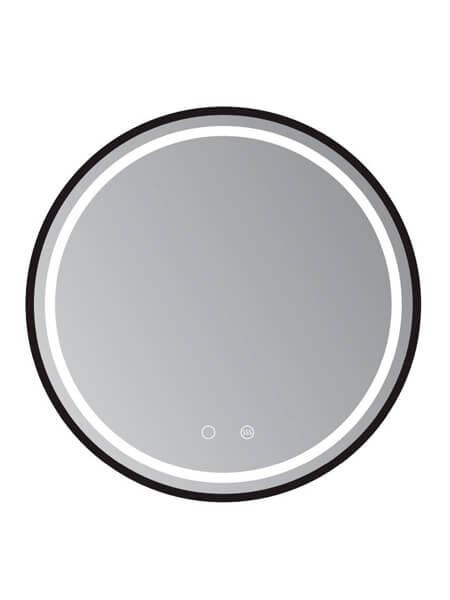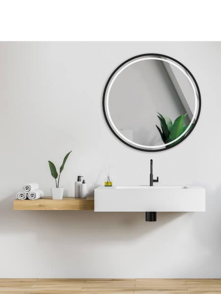 Espejo redondo, luz frontal, con sensor antivaho y on/off tri led. Luz cálida, neutra y fría. Ajustable en intensidad. Con marco negro mate.
