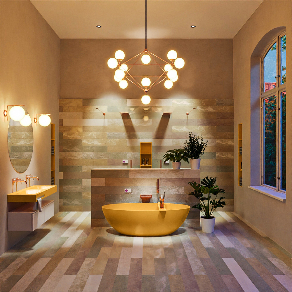 La forma ovalada se puede colocar bien de forma independiente, pero, como se muestra en la imagen, también luce espléndida delante de una pared o junto a ella. Esta magnífica disposición de baño se combina con el mueble de baño ALAN y nichos de Solid Surface. Tanto el lavabo como los muebles pueden combinar perfectamente con la bañera. Puedes elegir con confianza el color en tu baño.