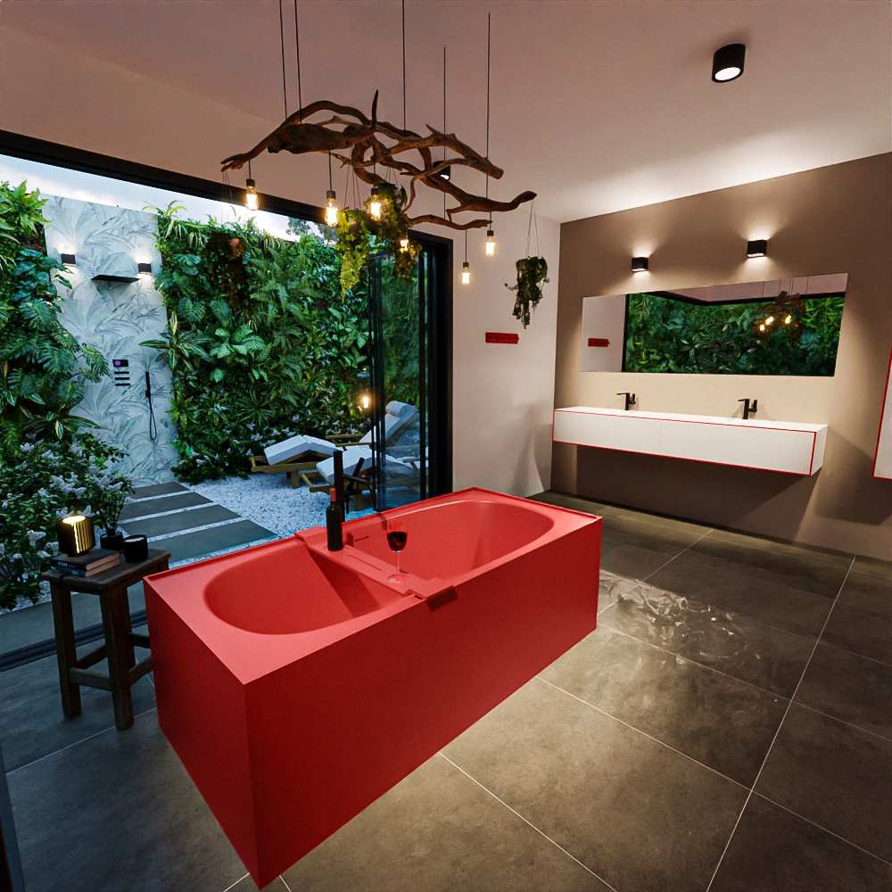 Tiene líneas limpias alrededor, lo que permite colocar la bañera tanto de forma independiente, semidetenido como en una esquina. Esta hermosa disposición de baño se combina con la serie LAGOM. Se trata de un mueble de baño completo de Solid Surface y un mueble de columna que se puede ajustar perfectamente en color a su bañera.