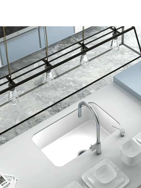 La resina técnica añadida, envuelve cada partícula de alúmina formando un material altamente compactado. La superficie de nuestros fregaderos está formulada por un Gel_Coat de altas resistencia y prestaciones.