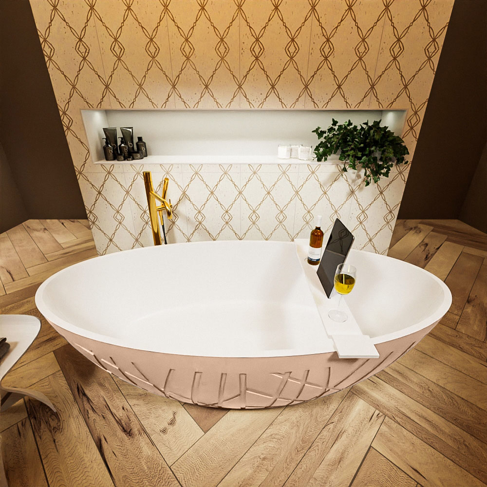 La bañera tiene una hermosa forma ovalada y con el relieve en 3D en el exterior, este baño se adapta perfectamente a cualquier baño. La configuración Holm se combina con el mueble de baño y las columnas de la serie FINE. Este mueble de baño tiene superficie sólida en todos los lados, que se une sin costuras con un lavabo a elección. Combinado con frentes de roble macizo en 2 colores o frentes de MDF en 14 colores.