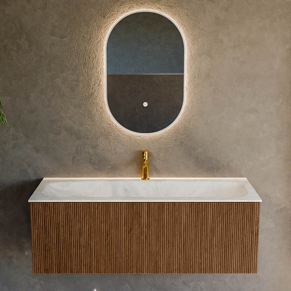 El mueble de baño definitivo que transforma tu baño en un oasis de refinamiento. Con sus tiras verticales semicirculares de roble macizo, disponibles en los colores roble y nogal, KURVE irradia artesanía en cada detalle. Las suaves curvas y las puertas inteligentemente diseñadas, cada una de 40 cm de altura, invitan al uso, mientras que el espacio interior se aprovecha al máximo gracias al generoso cajón de la misma altura.