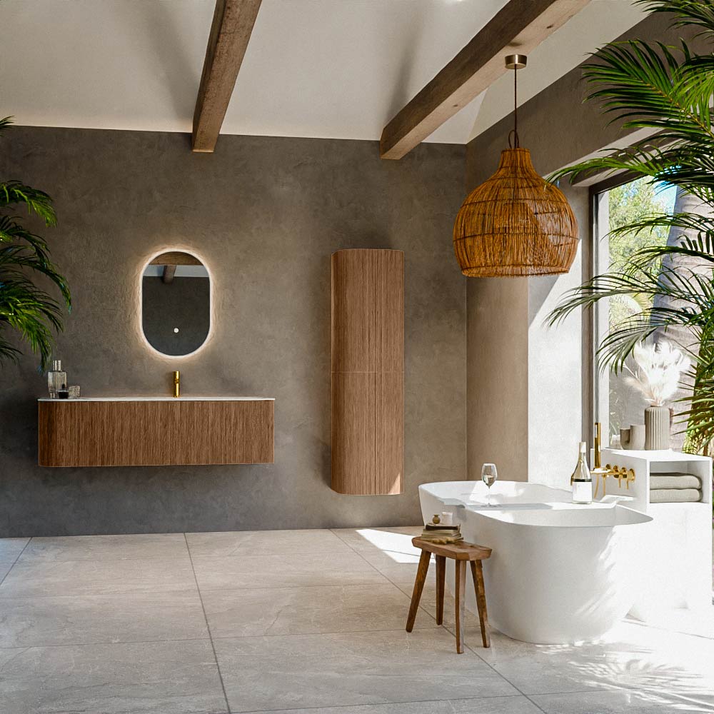 El mueble de baño definitivo que transforma tu baño en un oasis de refinamiento. Con sus tiras verticales semicirculares de roble macizo, disponibles en los colores roble y nogal, KURVE irradia artesanía en cada detalle. Las suaves curvas y las puertas inteligentemente diseñadas, cada una de 40 cm de altura, invitan al uso, mientras que el espacio interior se aprovecha al máximo gracias al generoso cajón de la misma altura.