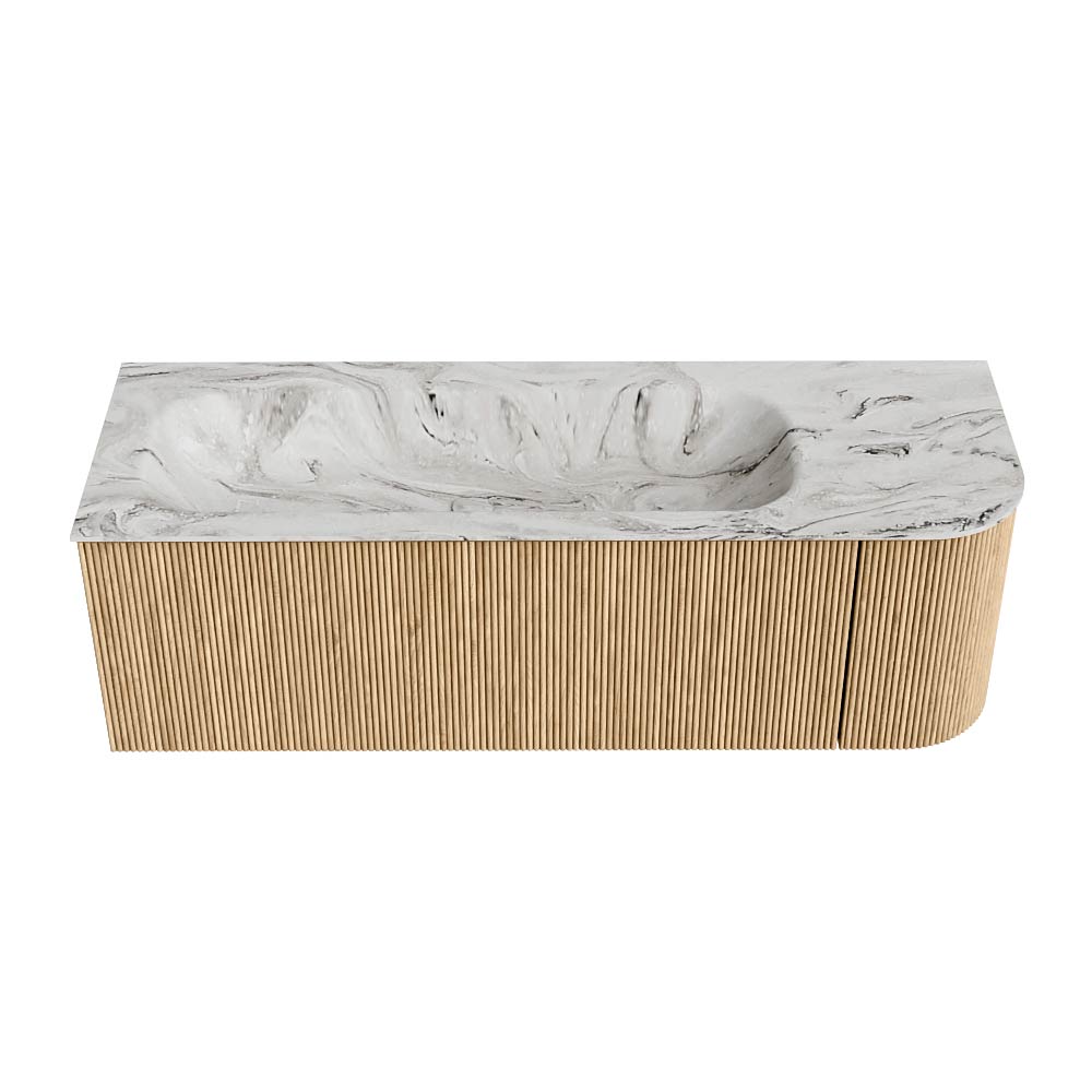 El mueble de baño definitivo que transforma tu baño en un oasis de refinamiento. Con sus tiras verticales semicirculares de roble macizo, disponibles en los colores roble y nogal, KURVE irradia artesanía en cada detalle. Las suaves curvas y las puertas inteligentemente diseñadas, cada una de 40 cm de altura, invitan al uso, mientras que el espacio interior se aprovecha al máximo gracias al generoso cajón de la misma altura.