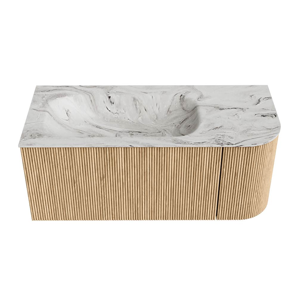 El mueble de baño definitivo que transforma tu baño en un oasis de refinamiento. Con sus tiras verticales semicirculares de roble macizo, disponibles en los colores roble y nogal, KURVE irradia artesanía en cada detalle. Las suaves curvas y las puertas inteligentemente diseñadas, cada una de 40 cm de altura, invitan al uso, mientras que el espacio interior se aprovecha al máximo gracias al generoso cajón de la misma altura.