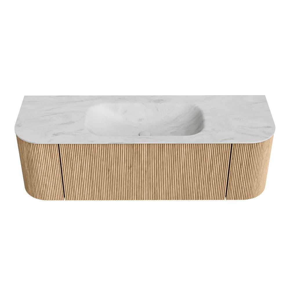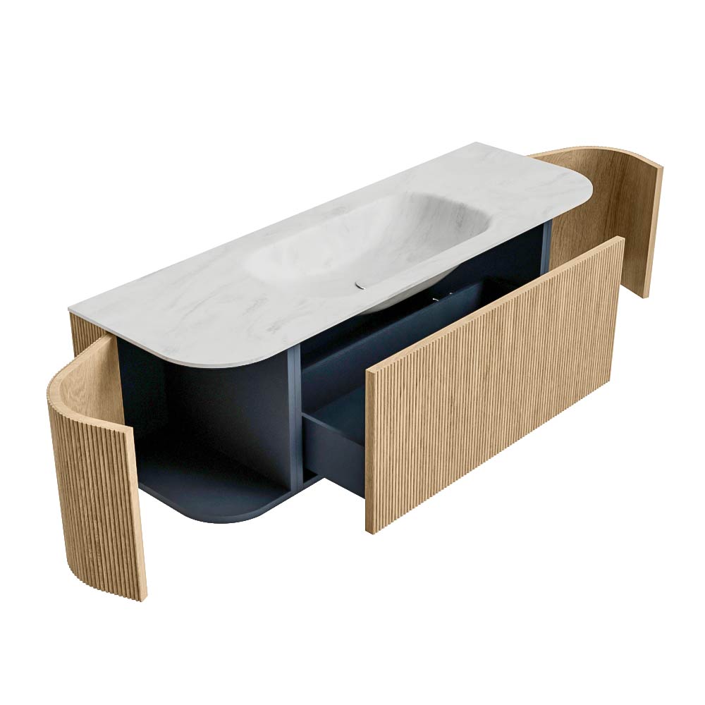 El mueble de baño definitivo que transforma tu baño en un oasis de refinamiento. Con sus tiras verticales semicirculares de roble macizo, disponibles en los colores roble y nogal, KURVE irradia artesanía en cada detalle. Las suaves curvas y las puertas inteligentemente diseñadas, cada una de 40 cm de altura, invitan al uso, mientras que el espacio interior se aprovecha al máximo gracias al generoso cajón de la misma altura.