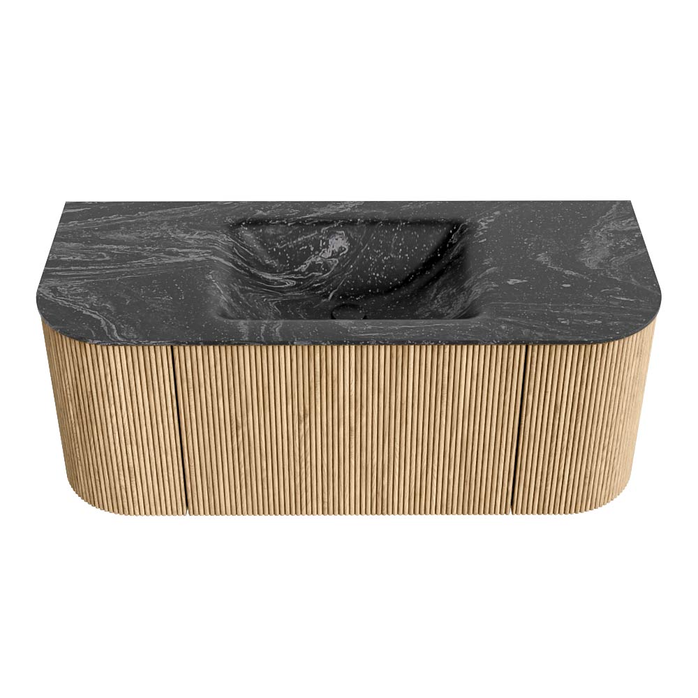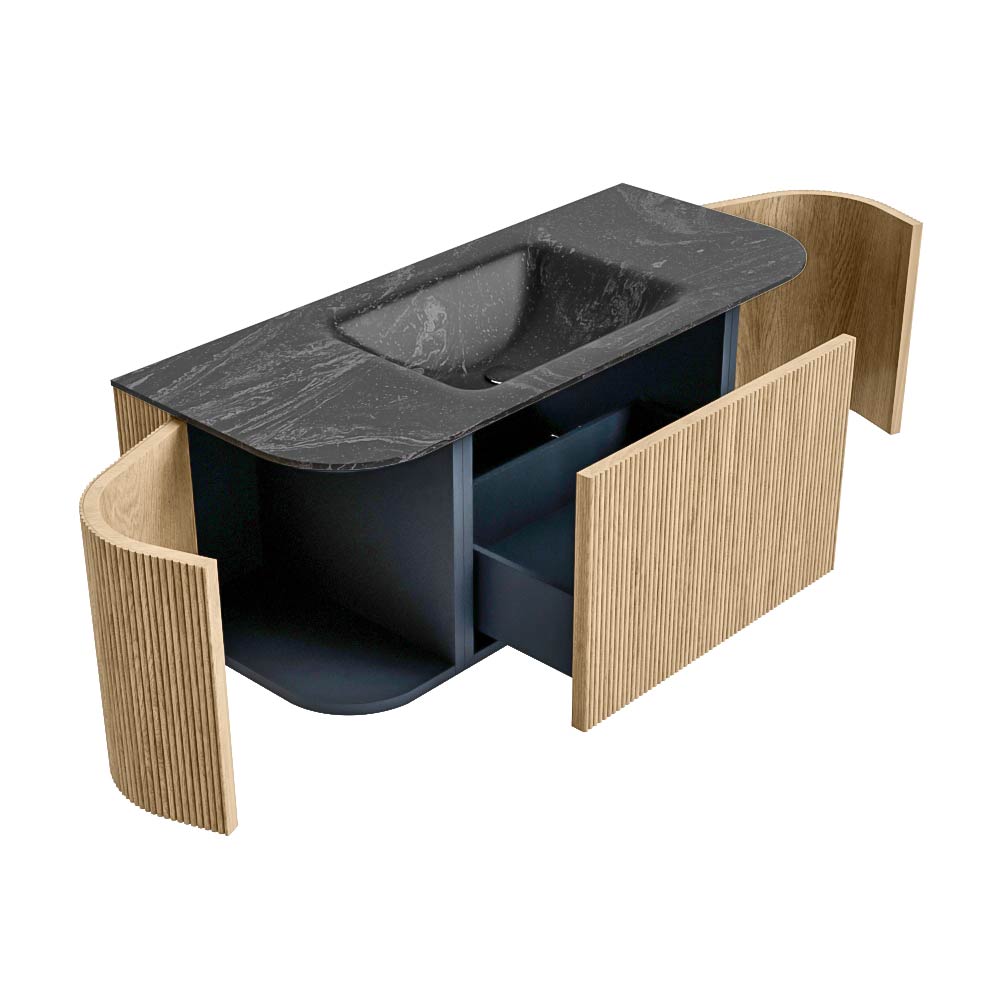 El mueble de baño definitivo que transforma tu baño en un oasis de refinamiento. Con sus tiras verticales semicirculares de roble macizo, disponibles en los colores roble y nogal, KURVE irradia artesanía en cada detalle. Las suaves curvas y las puertas inteligentemente diseñadas, cada una de 40 cm de altura, invitan al uso, mientras que el espacio interior se aprovecha al máximo gracias al generoso cajón de la misma altura.