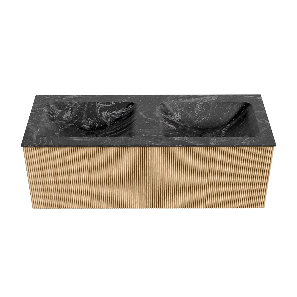 El mueble de baño definitivo que transforma tu baño en un oasis de refinamiento. Con sus tiras verticales semicirculares de roble macizo, disponibles en los colores roble y nogal, KURVE irradia artesanía en cada detalle. Las suaves curvas y las puertas inteligentemente diseñadas, cada una de 40 cm de altura, invitan al uso, mientras que el espacio interior se aprovecha al máximo gracias al generoso cajón de la misma altura.