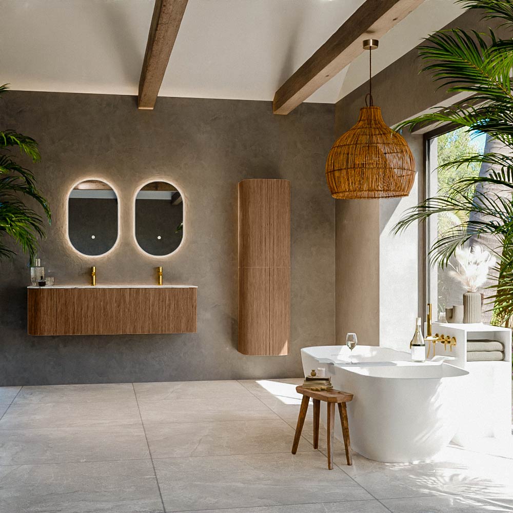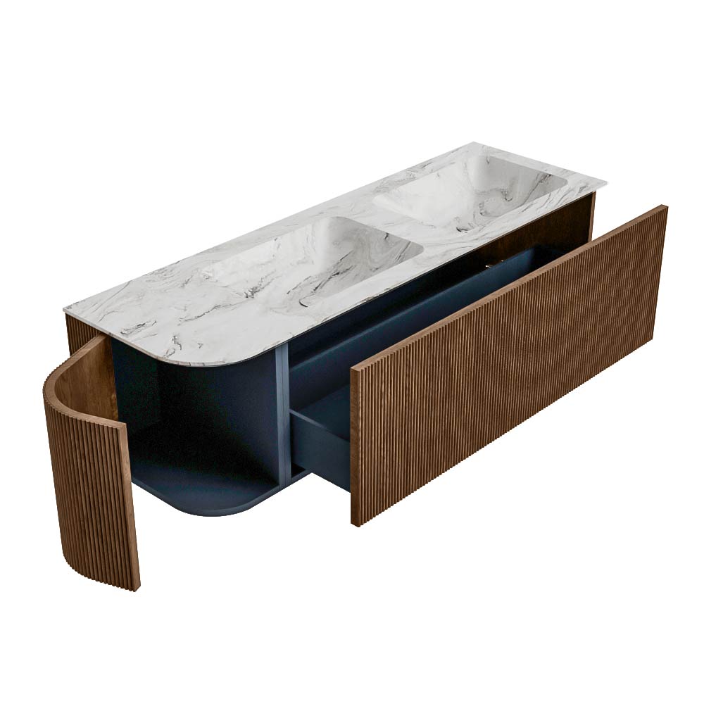 El mueble de baño definitivo que transforma tu baño en un oasis de refinamiento. Con sus tiras verticales semicirculares de roble macizo, disponibles en los colores roble y nogal, KURVE irradia artesanía en cada detalle. Las suaves curvas y las puertas inteligentemente diseñadas, cada una de 40 cm de altura, invitan al uso, mientras que el espacio interior se aprovecha al máximo gracias al generoso cajón de la misma altura.