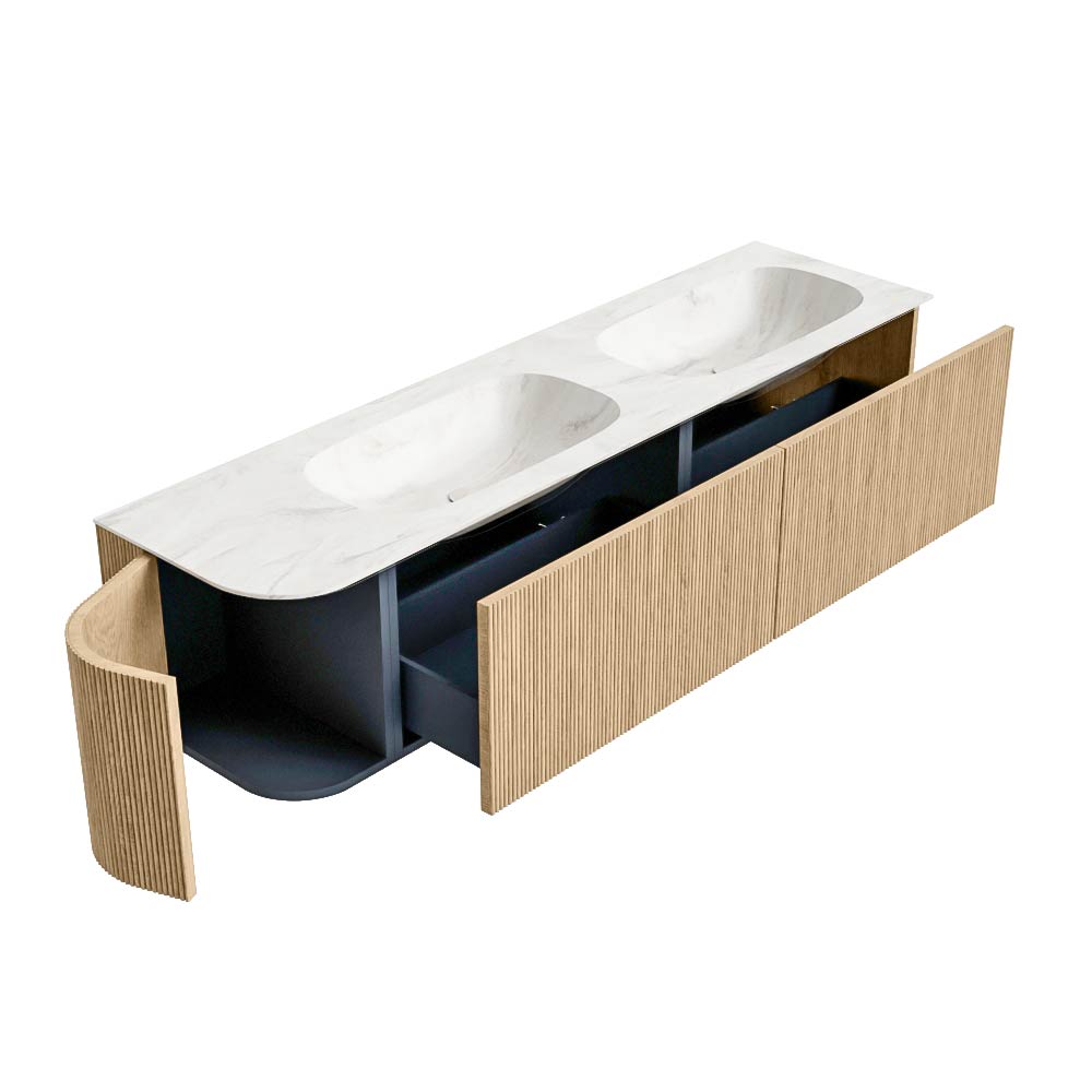 MONDIAZ KURVE-DLUX 175cm mueble de baño curva Izquierda color Oak con 2 cajones y 1 puerta. Lavabo STOR SMALL Doble / Derecho 2 orificios Ostra.