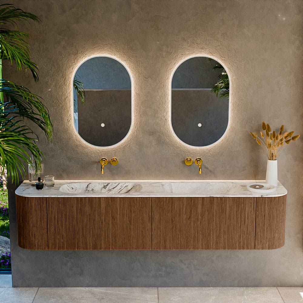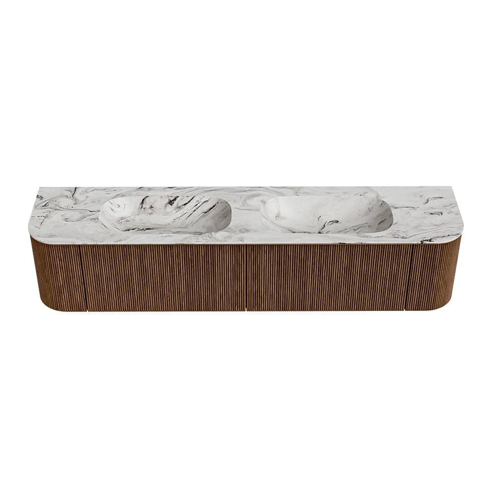 El mueble de baño definitivo que transforma tu baño en un oasis de refinamiento. Con sus tiras verticales semicirculares de roble macizo, disponibles en los colores roble y nogal, KURVE irradia artesanía en cada detalle. Las suaves curvas y las puertas inteligentemente diseñadas, cada una de 40 cm de altura, invitan al uso, mientras que el espacio interior se aprovecha al máximo gracias al generoso cajón de la misma altura.