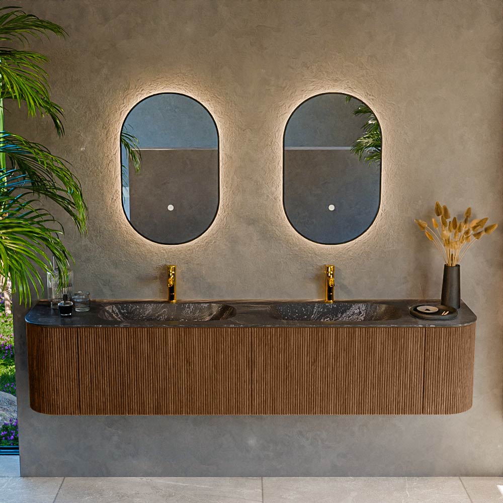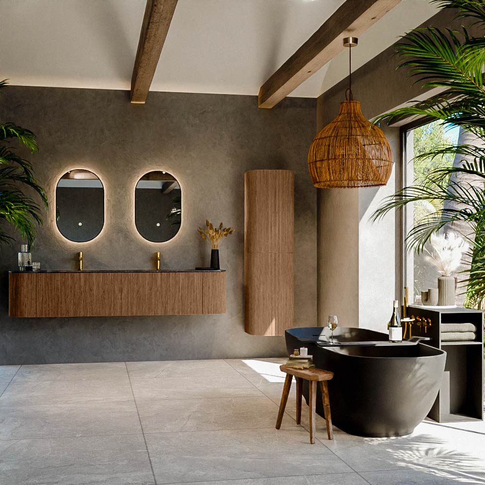 El mueble de baño definitivo que transforma tu baño en un oasis de refinamiento. Con sus tiras verticales semicirculares de roble macizo, disponibles en los colores roble y nogal, KURVE irradia artesanía en cada detalle. Las suaves curvas y las puertas inteligentemente diseñadas, cada una de 40 cm de altura, invitan al uso, mientras que el espacio interior se aprovecha al máximo gracias al generoso cajón de la misma altura.