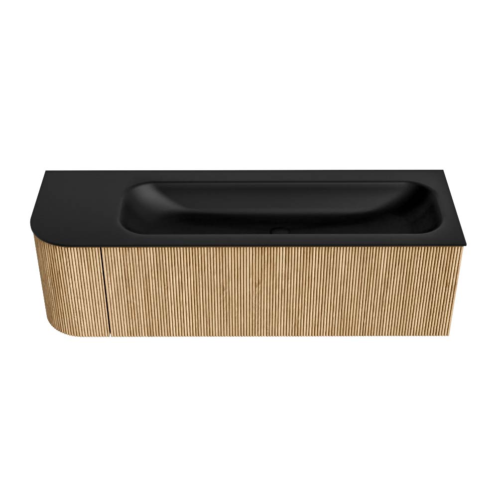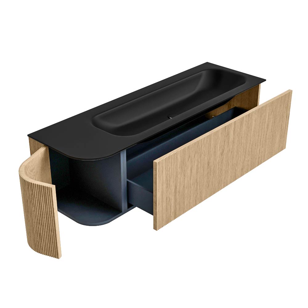 El mueble de baño definitivo que transforma tu baño en un oasis de refinamiento. Con sus tiras verticales semicirculares de roble macizo, disponibles en los colores roble y nogal, KURVE irradia artesanía en cada detalle. Las suaves curvas y las puertas inteligentemente diseñadas, cada una de 40 cm de altura, invitan al uso, mientras que el espacio interior se aprovecha al máximo gracias al generoso cajón de la misma altura.