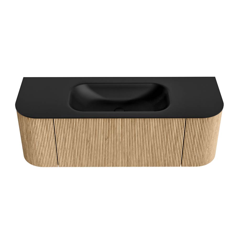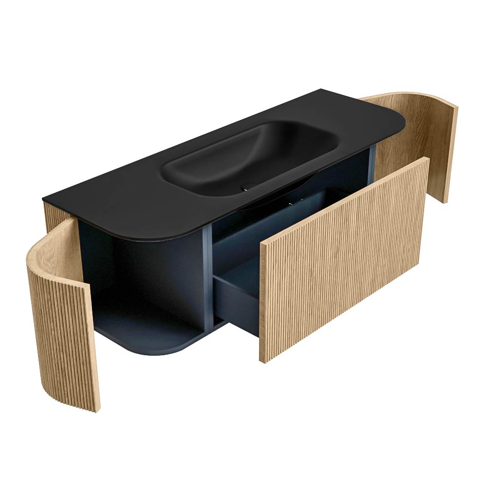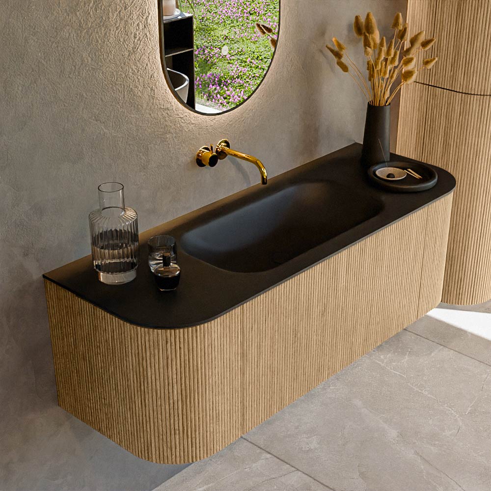 El mueble de baño definitivo que transforma tu baño en un oasis de refinamiento. Con sus tiras verticales semicirculares de roble macizo, disponibles en los colores roble y nogal, KURVE irradia artesanía en cada detalle. Las suaves curvas y las puertas inteligentemente diseñadas, cada una de 40 cm de altura, invitan al uso, mientras que el espacio interior se aprovecha al máximo gracias al generoso cajón de la misma altura.
