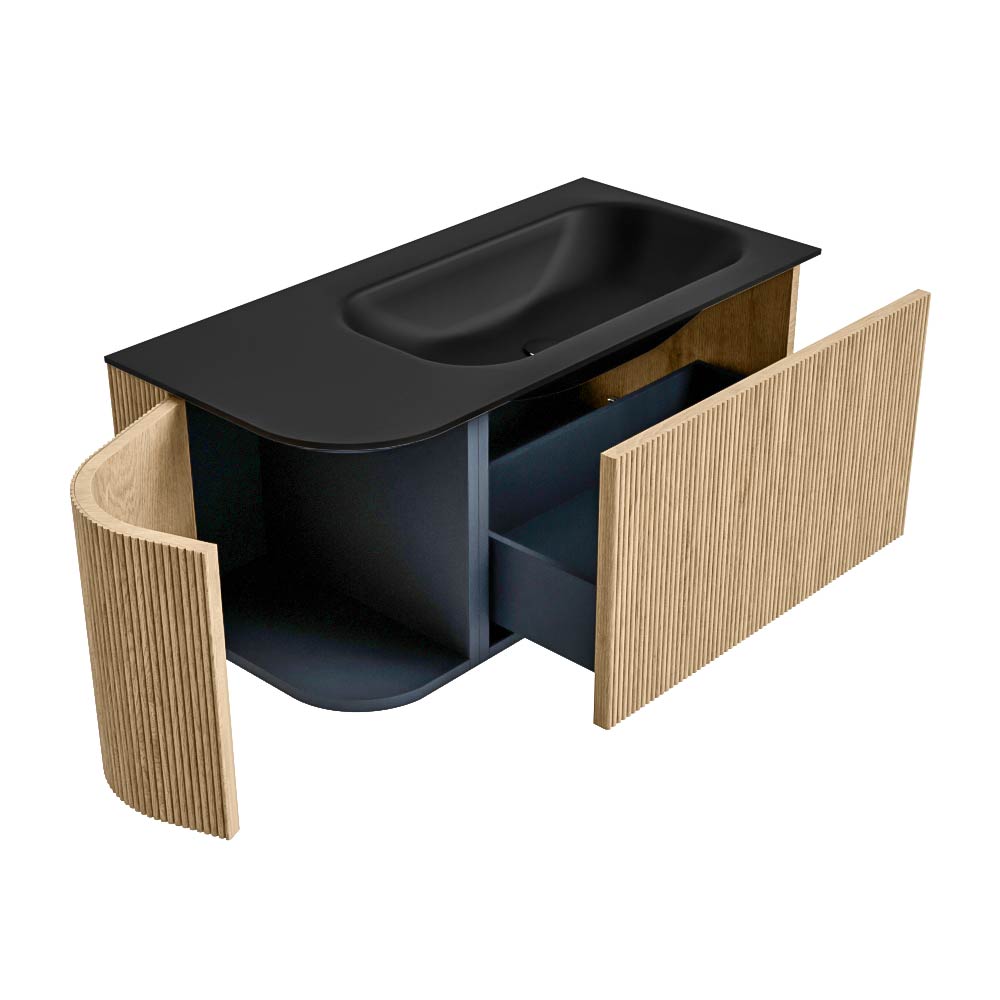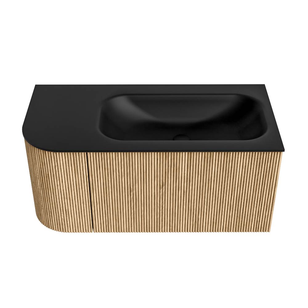 El mueble de baño definitivo que transforma tu baño en un oasis de refinamiento. Con sus tiras verticales semicirculares de roble macizo, disponibles en los colores roble y nogal, KURVE irradia artesanía en cada detalle. Las suaves curvas y las puertas inteligentemente diseñadas, cada una de 40 cm de altura, invitan al uso, mientras que el espacio interior se aprovecha al máximo gracias al generoso cajón de la misma altura.