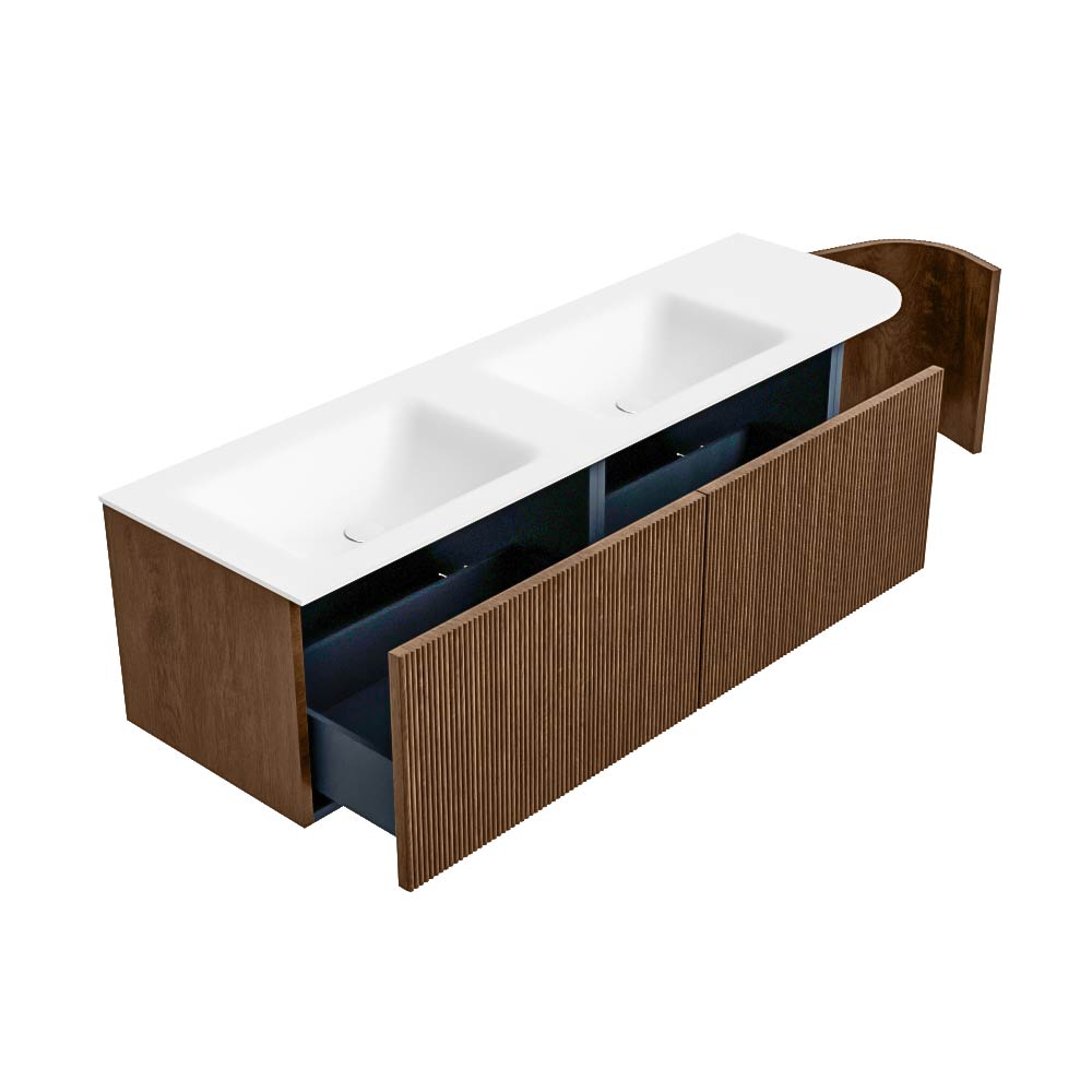 MONDIAZ KURVE 155cm mueble de baño curva Derecha color Walnut con 2 cajones y 1 puerta. Lavabo CLOUD Doble / Izquierda 2 orificios Talc.