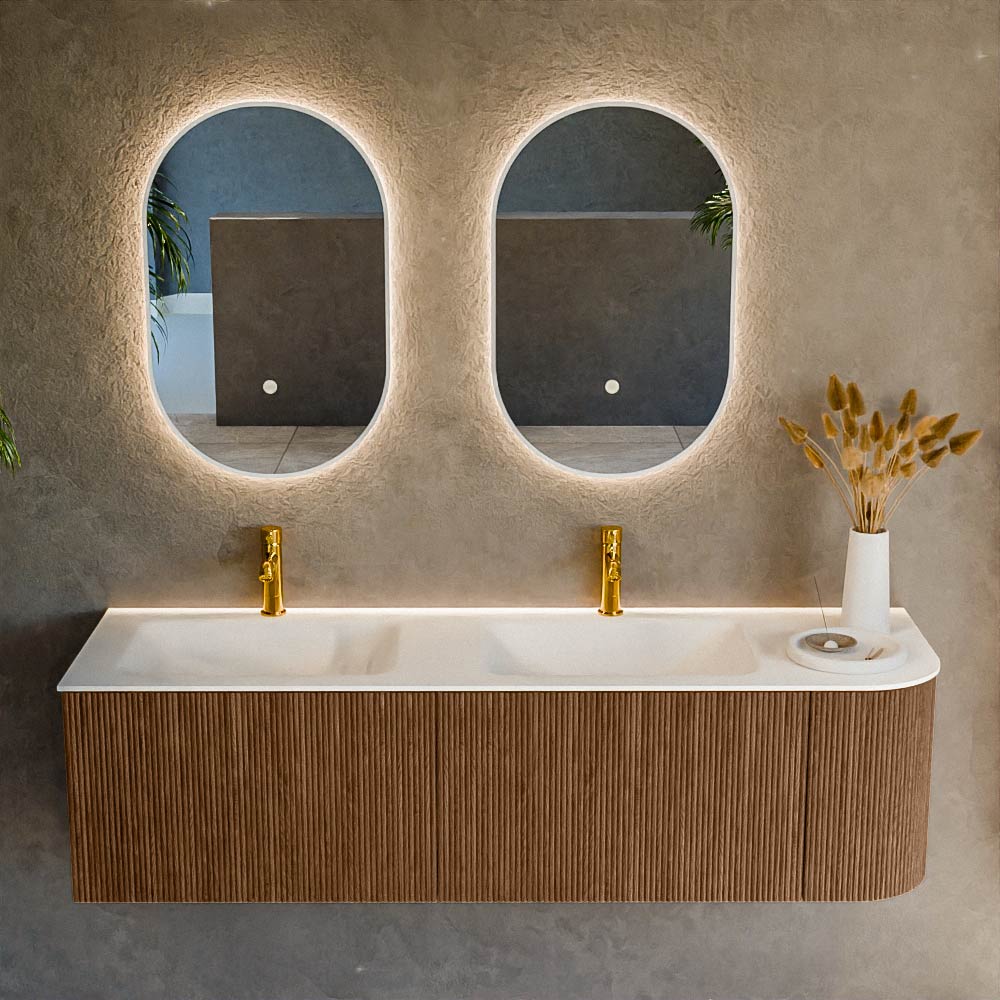 El mueble de baño definitivo que transforma tu baño en un oasis de refinamiento. Con sus tiras verticales semicirculares de roble macizo, disponibles en los colores roble y nogal, KURVE irradia artesanía en cada detalle. Las suaves curvas y las puertas inteligentemente diseñadas, cada una de 40 cm de altura, invitan al uso, mientras que el espacio interior se aprovecha al máximo gracias al generoso cajón de la misma altura.